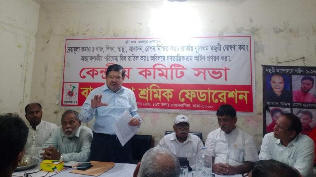 বাংলাদেশ শ্রমিক ফেডারেশনের ১১/১ তোপখানা রোডস্হ কার্য্যালয়ে জাতীয়তাবাদী শ্রমিকদল ও সন্মিলিত শ্রমিক পরিষদভুক্ত ২১টি শ্রমিক সংগঠনের এক জরুরী যৌথসভা ১৬’সেপ্টম্বর সোমবার ইন্জিনিয়ার ফয়েজ আহম্মেদের সভাপতিত্বে অনুষ্ঠিত হয়। সভায় বক্তব্য রাখেন প্রখ্যাত বামপন্হী নেতা কমরেড টিপু বিশ্বাস, সভায় প্রধান অতিথি হিসাবে বক্তব্য রাখেন চলমান শ্রমিক কর্মচারীদের আন্দোলনের প্রধান সমন্বয়কারী এ্যাডভোকট শিমুল বিশ্বাস। সভায় আরো বক্তব্য রাখেন শ্রমিকদলের আনোয়ার হোসাইন, এসএসপি’র মোশারফ হোসেন, মোশারেফ হোসেন মন্টু, হারুনুর রশিদ, আব্দুর রহমান, মীর মোফাজ্জল হোসেন, সোহেল সিকদার, রফিকুল ইসলাম পথিক, বাবুল বিশ্বাস, নেক মোহাম্মদ , বাচ্চু ভূইয়া, শ্রমিক দলের রফিকুল ইসলাম, মন্জুরুল ইসলাম মন্জু , এসএসপি’র সোহেল সিকদার, সোহেল রানা সম্পদ,সাইফুল ইসলাম, মওলানা ওমর ফারুক,কাইয়ুম হোসেন, দেবাশীষ বিশ্বাস, ফিরোজ মিয়া, জামিল হোসাইন, একেএম আওয়াল প্রমূখ। সভায় বৈষম্যবিরোধী ছাত্র শ্রমিক জনতার গনঅভ্যুত্থানে শহীদদের স্বরনে এক মিনিট নিরবতা পালন করা হয়। সভায় উল্লেখ করা হয় বিবিএস’এর সরকারি হিসাব মতে বাংলাদেশে ৭ কোটি ৩৫ লাখ শ্রমিক কর্মচারী। সভা বিবিএস’এর হিসাবমত সকল শ্রমিক কর্মচারীদের কর্মসংস্হানের সুযোগ সৃষ্টির জন্য, অসংগঠিত শ্রমিক কর্মচারীদের সংগঠিত করে প্রতিটি প্রতিষ্ঠানে নিরাপদ কর্মপরিবেশ নিশ্চিত করা এবং শিল্প কারখানায় উৎপাদন স্বাভাবিক রাখা, ও শ্রমিক কর্মচারীদের নায্য মজুরী প্রাপ্তি নিশ্চিত করার জন্য জাতীয়তাবাদী শ্রমিকদল ও সন্মিলিত শ্রমিক পরিষদ ভুক্ত ২১ টি শ্রমিক সংগঠন ঐক্যবদ্ধভাবে কাজ করার জন্য দৃঢ প্রত্যয় ঘোষনা করে। সভায় ফ্যাসিবাদ বিরোধী আন্দোলনে নিহত শ্রমিক কর্মচারীদের উপযুক্ত ক্ষতিপূরণ ও আহতদের সুচিকিৎসার জন্য রাষ্ট্র ও সরকারের প্রতি উদ্বাত্ব আহব্বান জানানো হয়। সভায় উল্লেখ করা হয় ফ্যাসিবাদী হাসিনার পতন হলেও তার অনেক সুবিধাভোগী ও সহযোগী ছদ্মবেশে জুলাই আগষ্ট গনঅভ্যুত্থানের স্প্রিট ধ্বংস করার জন্য ষড়যন্ত্র করছে। সভায় আরো উল্লেখ করা হয় গনঅভ্যুত্থানে পরাজিত শক্তি বিভিন্ন সংগঠনের মধ্য অনুপ্রবেশ করার অপচেষ্ঠা করছে, তাদের অপচেষ্টা প্রতিরোধ করার জন্য সভায় সকলকে সতর্কতার আহব্বান জানানো হয়। সভায় ফ্যাসিবাদের সকল চিহৃ উচ্ছেদ করার জন্য সরকারকে সংস্কার কাজ দ্রুত শেষ করে গনতন্ত্র সুসংহত করার জন্য নির্বাচিত সরকার গঠনের আহব্বান জানানো হয়। সভায় শিল্পকারখানায় শান্তিপূর্ণ পরিবেশ রক্ষা ও শ্রমিক কর্মচারীদের নায্য মজুরী আদায়ের জন্য শিল্পাঞ্চল, কল, কারখানা সংশিষ্ট বিভিন্ন এলাকায় শ্রমিক কর্মচারীদের সভা আয়োজনের সিদ্ধান্ত নেওয়া হয়।