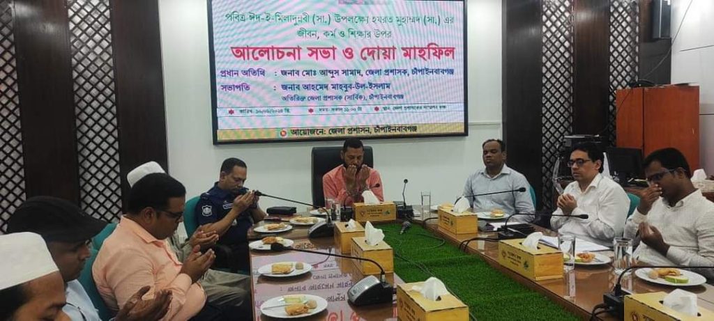 মাহিদুল ইসলাম ফরহাদ ; পবিত্র ঈদ-ই-মিলাদুন্নবী (সা.) উপলক্ষে হযরত মুহাম্মদ (সা.) এর জীবন, কর্ম ও শিক্ষার উপর চাঁপাইনবাবগঞ্জ জেলা প্রশাসনের আয়োজনে আলোচনা সভা ও দোয়া মাহফিল অনুষ্ঠিত হয়েছে সোমবার (১৬ সেপ্টেম্বর) সকালে চাঁপাইনবাবগঞ্জ জেলা প্রশাসকের সম্মেলন কক্ষে ১২ রবিউল আউয়াল উপলক্ষে হযরত মুহাম্মদ (সা.) এর জীবন, কর্ম ও শিক্ষার ওপর আলোচনা ও দোয়া মাহফিল অনুষ্ঠানে প্রধান অতিথির বক্তব্য দেন সদ্য যোগদানকৃত জেলা প্রশাসক আব্দুস সামাদ। তিনি বলেন নবী করিম (সা.) এর জীবনাদর্শ আমাদের মেনে চলতে হবে। আমরা যদি মেনে চলি তাহলে ঘুষ-দুর্নীতি কখনই স্থান পাবে না। বলেন, নতুন বাংলাদেশ গড়ার যে চেতনা তা ধারণ করে ঘুষ দুর্নীতি শোষণমুক্ত বাংলাদেশ গঠনে সকলকে এগিয়ে আসার আহ্বান জানান তিনি। সভায় অতিরিক্ত জেলা প্রশাসক (সার্বিক) আহমেদ মাহবুব-উল-ইসলামের সভাপতিত্বে আলোচনা ও দোয়া মাহফিলে অংশ নেন জেলা প্রশাসনের স্থানীয় সরকার শাখার উপ-পরিচালক ও সরকারের উপসচিব দেবেন্দ্র নাথ উরাঁও, অতিরিক্ত জেলা প্রশাসক (রাজস্ব) আসিফ আহমেদ, অতিরিক্ত জেলা প্রশাসক (শিক্ষা ও আইসিটি) পাপিয়া সুলতানা, অতিরিক্ত জেলা ম্যাজিস্ট্রেট ইকতেখারুল ইসলাম, অতিরিক্ত পুলিশ সুপার (ক্রাইম ও অপারেশন) নূরুজ্জামন, ইসলামিক ফাউন্ডেশনের উপরিচালক গোলাম মোস্তফা, জেলা কৃষি সম্প্রসারণ অধিদপ্তরের অতিরিক্ত উপপরিচালক (শস্য) কে.এম. কাওছার হোসেন, জেলা তথ্য অফিসার আব্দুল আহাদ, জেলা মডেল মসজিদ ও ইসলামিক সাংস্কৃতিক কেন্দ্রের পেশ ইমাম মুখতার আলীসহ অন্যরা। পরে দোয়া মাহফিল অনুষ্ঠিত হয়।