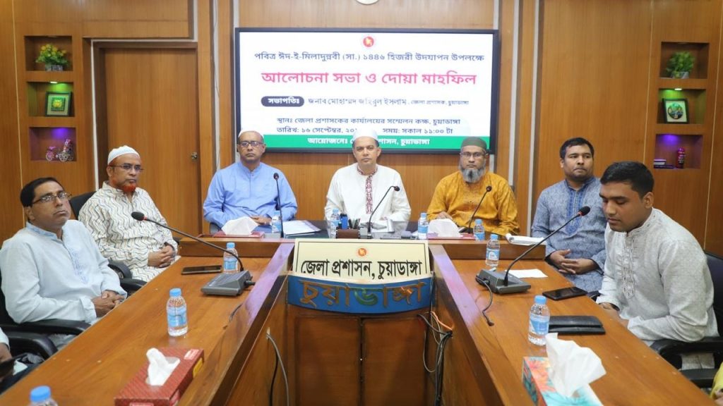 পবিত্র ঈদ-ই-মিলাদুন্নবী(স.)১৪৪৬ হিজরী উদযাপন উপলক্ষে জেলা প্রশাসকের সম্মেলন কক্ষে ১৬ সেপ্টেম্বর ২০২৪ তারিখ সকাল ১১ টার সময় যথাযোগ্য ধর্মীয় ভাব গম্ভীর্যের মধ্যদিয়ে সারাদেশের ন্যায় চুয়াডাঙ্গায় পবিত্র ঈদ-ই মিলাদুন্নবী (সা.)উপলক্ষে আলোচনা সভা ও দোয়া মাহফিল অনুষ্ঠিত হয়। উক্ত অনুষ্ঠানে বিশেষ অতিথি হিসাবে উপস্থিত ছিলেন চুয়াডাঙ্গার পুলিশ সুপার খন্দকার গোলাম মওলা, বিশেষ অতিথির বক্তব্যে পুলিশ সুপার মহোদয় বলেন, আজ প্রিয় নবী হজরত মুহম্মদ (সা.) এর জন্ম ও ওফাতের দিন।৫৭০ খ্রিষ্টাব্দের এই দিনে মানবজাতির জন্য রহমত হিসেবে প্রেরিত মহানবী হযরত মুহাম্মদ (সা.) আরবের মক্কা নগরীর সম্ভ্রান্ত কুরাইশ বংশে মা আমিনার কোল আলোকিত করে জন্মগ্রহণ করেন। তিনি রিসালাতের দায়িত্ব পালন শেষে ৬৩২ খ্রিষ্টাব্দে ঠিক এ তারিখেই ৬৩ বছর বয়সে শেষ নিশ্বাস ত্যাগ করেন। তিনি বিশ্ব মানবতার জন্য অনিন্দ্য সুন্দর অনুসরণীয় শিক্ষা ও আদর্শ রেখে গেছেন; যা প্রতিটি যুগ ও শতাব্দীর মানুষের জন্য মুক্তির দিশারি হিসেবে পথ দেখাবে। উক্ত অনুষ্ঠানের জেলা প্রশাসক, আয়োজনে মোহাম্মদ জহিরুল ইসলাম, এর সভাপতিত্বে আরোও উপস্থিত ছিলেন সাজ্জাৎ হোসেন, সিভিল সার্জন, চুয়াডাঙ্গাসহ বিভিন্ন সরকারি দপ্তরের কর্মকর্তা কর্মচারীবৃন্দ;জেলা ইসলামিক ফাউণ্ডেশনের কর্মকর্তাবৃন্দ এবং বিভিন্ন মসজিদের ইমামগণ।