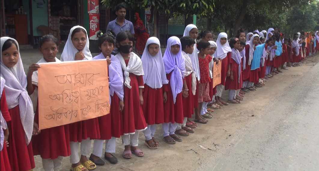 প্রাথমিক বিদ্যালয়ের নাম পরিবর্তনের প্রতিবাদে শিক্ষক শিক্ষার্থী অভিভাবকদের মানববন্ধন