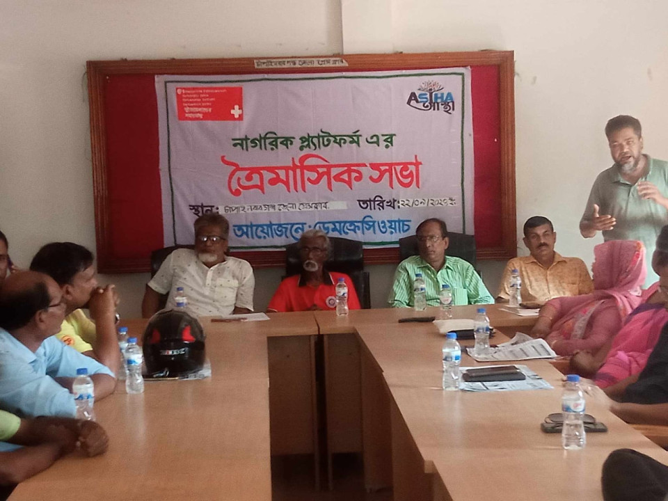 মাহিদুল ইসলাম ফরহাদ: নাগরিক প্লাটফর্মের সদস্যদের নিয়ে ত্রৈমাসিক সভা অনুষ্ঠিত হয়েছে।২২ সেপ্টেম্বর রোববার সকাল ১১ টায় চাঁপাইনবাবগঞ্জ জেলা প্রেসক্লাবের হলরুমে ডেমোক্রেসি ওয়াচের বাস্তবায়নে ও আস্থা প্রকল্পের সহযোগিতায় এ সভা অনুষ্ঠিত হয়। আস্থা নাগরিক প্লাটফর্মের জেলা সভাপতি অবসরপ্রাপ্ত প্রফেসর মোঃ শাহ আলম এর সভাপতিত্বে বক্তব্য রাখেন,নাগরিক প্লাটফর্মের সদস্য ও সিনিয়র সাংবাদিক মোঃ জোনাব আলী, ডাবলুকুমার ঘোষ চাঁপাইনবাবগঞ্জ জেলা শিশু বিষয়ক কর্মকর্তা সফিকুল ইসলাস, চেম্বারের পরিচালক মোঃ শহিদুল ইসলাম, সদস্য আব্দুস সালাম,চাঁপাই প্রেসক্লাবের সভাপতি আক্তারুজ্জামান, সাধারণ সম্পাদক জমশেদ আলী। বক্তৃতরা বলেন আস্থা প্রকল্প যুবদের নিয়ে যে সব কর্মপরিকল্পনা নিয়েছে তা বাস্তবায়নে সর্বাক্ত সহযোগিতা করার আশ্বাস দেন বক্তরা। নাগরিক প্লাটফর্মের বিশিষ্টজনরা বলেন এই যুব ফোরাম গুলোর দিকনির্দেশনা ও সহযোগিতার মেলবন্ধন তৈরীর মাধ্যমে যুব নেতৃত্বর বিকাশ, সাম্প্রদায়িক সম্প্রীতি রক্ষা ও সন্ত্রাসমুক্ত সমাজ গঠনে ভূমিকা রাখবে। আস্থা প্রকল্পের জেলা সমন্বয়কারী রেজাউল করিম এর সঞ্চালনায় অন্যদের মধ্যে উপস্থিত ছিলেন নারী উদ্যোক্তা আফসানা খাতুন,শরিফা খাতুন সিনিয়র ফিল্ড অফিসার আরিফা খাতুন, জেলার বিশিষ্ট পেশাজীবী প্রতিনিধি, সাংবাদিক, মানবাধিকার কর্মী, আইনজীবী, শিক্ষকবৃন্দসহ যুব ফোরামের সদস্যরা উপস্থিত ছিলেন।