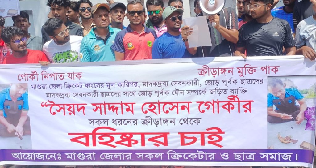 তৌহিদ,সহসম্পাদক : মাগুরা জেলা ক্রীড়া সংস্থার ক্রিকেট কোচ সৈয়দ সাদ্দাম হোসেন গোর্কীকে সকল ধরনের ক্রীড়াঙ্গন থেকে বহিষ্কার চেয়ে মিছিল ও মানববন্ধন করেছে মাগুরার ক্রিকেট প্রেমী জনতা।