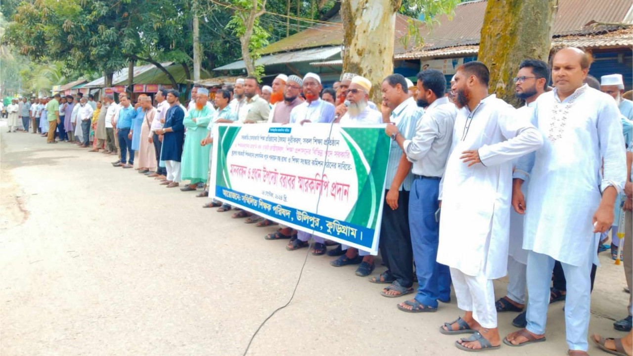 কুড়িগ্রামের উলিপুরে সরকারি-বেসরকারি শিক্ষা প্রতিষ্ঠানের বৈষম্য দূরীকরণ, সকল শিক্ষা প্রতিষ্ঠান ও শিক্ষকবৃন্দের হয়রানি বন্ধ, চাকুরী জাতীয়করণ, শিক্ষা প্রশাসনের বিভিন্ন পদে সরকারি স্কুলের সহকারী শিক্ষকদের প্রশাসনিক পদে পদায়ন বন্ধ রাখা ও শিক্ষা সংস্কার কমিশন গঠনের দাবিতে মানববন্ধন ও ইউএনও'র মাধ্যমে প্রধান উপদেষ্টা বরাবর স্মারকলিপি প্রদান করা হয়েছে। মঙ্গলবার (২৪ সেপ্টেম্বর) বেলা সাড়ে ১১টায় উপজেলার সম্মিলিত শিক্ষক পরিষদের আয়োজনে উপজেলা চত্বরে মানববন্ধন অনুষ্ঠিত হয়। মানববন্ধনে উপজেলার বিভিন্ন মাধ্যমিক, উচ্চ মাধ্যমিক ও মাদরাসার শিক্ষক ও কর্মচারীরা অংশ নেয়। এ সময় বক্তব্য রাখেন, অধ্যক্ষ মাও. মো. শফিকুর রহমান, প্রধান শিক্ষক আব্দুস ছাত্তার, অধ্যক্ষ মোবাশ্বের রাশেদীন, অধ্যক্ষ মাহাতাব উদ্দিন। প্রধান শিক্ষক শ্যামল চন্দ্রের সঞ্চালনায় শিক্ষকগণের পক্ষে বিভিন্ন যৌক্তিক বিষয় তুলে ধরে আরো বক্তব্য রাখেন, শামছুল আলম, আবুল হোসেন, সাজাদুল ইসলাম সাজু, ফজলে রাব্বি, ইউনুস আলী, মুক্তা জাহান প্রমুখ।বক্তারা বৈষম্য দূরীকরণে বেসরকারি শিক্ষক ও কর্মচারীগণের বাড়ি ভাড়া, চিকিৎসা ভাতা ও উৎসব ভাতাসহ চাকুরি জাতীয়করণের জোর দাবি জানান। মানববন্ধন শেষে উপজেলা নির্বাহী অফিসারের মাধ্যমে অন্তর্বর্তীকালীন সরকারের প্রধান উপদেষ্টাসহ সংশ্লিষ্ট বিভিন্ন দপ্তরে স্মারকলিপি প্রদান করা হয়েছে।