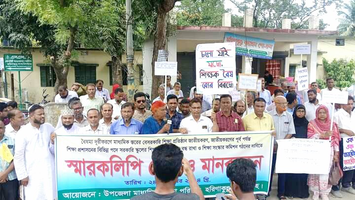 শিক্ষায় জাতির মেরুদণ্ড। তাইতো বলতেই হয়” তুমি আমাকে একটি শিক্ষিত মা দাও, আমি তোমাকে শিক্ষিত জাতি উপহার দিবো”। এই জাতি গঠনে শিক্ষা ছাড়া কোনো বিকল্প নেই। তারই ধারাবাহিকতায় সারা দেশের ন্যায় ঝিনাইদহের হরিণাকুণ্ডু উপজেলাতে মাধ্যমিক শিক্ষা জাতীয়করণের দাবিতে মানববন্ধন অনুষ্ঠিত হয়েছে। মঙ্গলবার ২৪ সেপ্টেম্বর সকালে বৈষম্য দূরিকরণের লক্ষে মাধ্যমিক শিক্ষা জাতীয়করণসহ অন্যান্য দাবিতে হরিনাকুণ্ডু উপজেলা মাধ্যমিক শিক্ষক পরিবারের উদ্যোগে হরিণাকুণ্ডু উপজেলা নির্বাহী কর্মকর্তার নিকট শিক্ষা সচিবের বরাবর দাবি সম্বলিত স্মারকলিপি প্রদান করেন। এর পূর্বে দোয়েল চত্বরে আয়োজিত শিক্ষক সমাবেশে প্রধান বক্তা হিসেবে বক্তব্য রাখেন শিক্ষক সমিতির হরিনাকুণ্ডু উপজেলা সভাপতি আবুল হাসান মাস্টার। বিশেষ বক্তা হিসেবে, বক্তব্য রাখেন হরিণাকুণ্ডু শিক্ষক সমিতির সেক্রেটারী মাকসুদুল হক টিটু। এছাড়াও মাধ্যমিক শিক্ষা জাতীয়করণের দাবিতে এই মানববন্ধনে অংশ নেন শিক্ষক নেতা খালেকুজ্জামান খালেক, নিয়ামত আলী, রেজাউল ইসলাম,জামিনুর রহমান, জামাল হোসেন সহ উপজেলার অন্যান্য শিক্ষক নেতৃবৃন্দ।