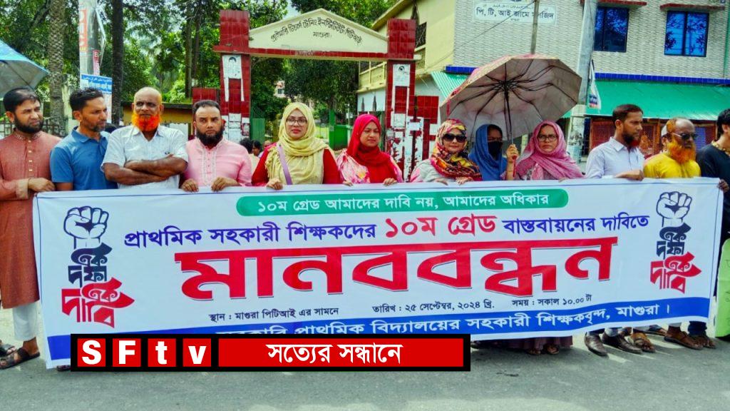 মাগুরায় প্রাথমিক সহকারী শিক্ষকগন ১০ম গ্রেড বাস্তবায়নের দাবিতে মানববন্ধন করেছে।বুধবার ২৫ সেপ্টেম্বর সকাল ১০ টায় মাগুরা পিটিআই ইনিস্টিউটের সমানে এ মানববন্ধন অনুষ্ঠিত হয়।এ মানববন্ধনে মাগুরা জেলার বিভিন্ন প্রাথমিক বিদ্যালয় থেকে আগত শিক্ষকগণ উপস্থিত ছিলেন।মানববন্ধনে উপস্থিত শিক্ষকগন বলেন আমরা সহকারী শিক্ষকরা স্নাতক/ স্নাতকোত্তর পাশ অথচ আমাদের ১৩ তম গ্রেডে চাকরি করতে হচ্ছে যা আমাদের শিক্ষক জাতীয় জন্য লজ্জা জনক।এছাড়া যেখানে নার্স প্রফেশনে যারা চাকরি করছে তারা ডিপ্লোমা পাশ অথচ তারা ১০ গ্রেডে চাকরি করছে। একই দেশে এই দুই নীতি শোভা পাওয়া উচিত নয়।তাই প্রাথমিক সহকারী শিক্ষকদের ১০ গ্রেড বাস্তবায়নের দাবি শুধু আমাদের দাবি নয় এটা আমাদের অধিকার।