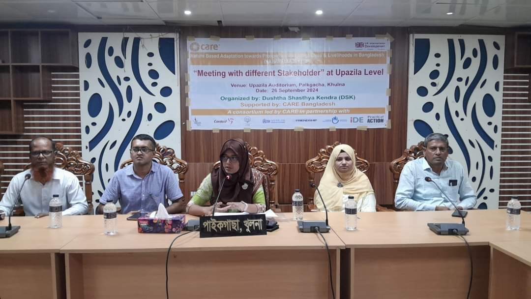 এম জালাল উদ্দীন বাংলাদেশে সমৃদ্ধ ও দক্ষ জীবন ও জীবিকার প্রতি প্রকৃতি ভিত্তিক অভিযোজন বিষয়ে উপজেলা পর্যায়ে ওয়াশ কম্পান্যান্টের উদ্যোগে বিভিন্ন স্টেকহোল্ডারদের সাথে মতবিনিময় সভা অনুষ্ঠিত হয়েছে। বৃহস্পতিবার সকাল ১১ টায় উপজেলা পরিষদ মিলনায়তনে আয়োজিত সভায় প্রধান অতিথি ছিলেন, উপজেলা নির্বাহী অফিসার মাহেরা নাজনীন। মতবিনিময় সভায় সভাপতিত্ব করেন, সিনিয়র উপজেলা মৎস্য কর্মকর্তা সৈকত মল্লিক। মূল বিষয়বস্তুর উপর বক্তব্য উপস্থাপন করেন, পাইকগাছা নবপল্লব প্রকল্পের রিজিওনাল ম্যানেজার আবুল হাসান সিদ্দিকী মিলন। দুস্থ স্বাস্থ্য কেন্দ্র (ডিএসকে) আয়োজনে এবং কেয়ার বাংলাদেশ এর সহযোগীতায় এসময় উপস্থিত ছিলেন, উপজেলা মাধ্যমিক শিক্ষা কর্মকর্তা শাহাজাহান আলী শেখ, শিক্ষা কর্মকর্তা বিদ্যুৎ রঞ্জন সাহা, মহিলা বিষয়ক কর্মকর্তা রেশমা আক্তার, সহকারী প্রকৌশলী আব্দুল্লাহ আল মামুন, উপ-সহকারী কৃষি কর্মকর্তা শেখ তোফায়েল আহমেদ তুহিন, এলইডিএআরএস কর্মকর্তা দেবব্রত গাইন, ডরপ উপজেলা সমন্বয়কারী পিন্টু চন্দ্র দাস, এসডিএফ সিও নাসিম আহমেদ, নবলোকের মোঃ সাজ্জাদ সরকার, সমীর মন্ডল, রিয়াজ আহমেদ, নবপল্লব প্রকল্পের মনিটরিং এন্ড ইভালুয়েশন অফিসার মোঃ রেজাউল ইসলাম, উপজেলা কো-অর্ডিনেটর মোঃ জাহিদুর রহমান পিয়াস, ফাইনান্স এন্ড লজিষ্টিক অফিসার শামীমা পিয়া, ক্যাপাসিটি বিল্ডিং অফিসার রোজিনা খাতুন সহ বিভিন্ন দপ্তরের কর্মকর্তা, সাংবাদিক ও এনজিও প্রতিনিধি বৃন্দ।
