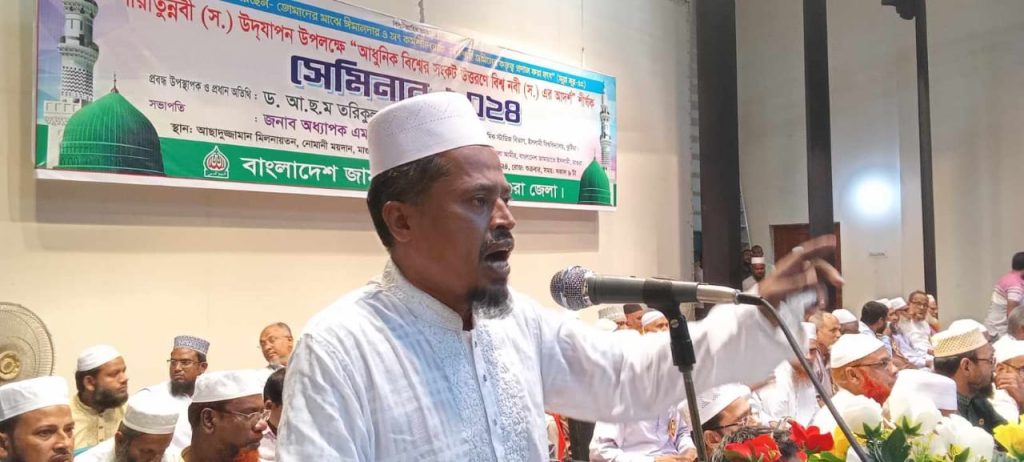 তৌহিদ,সহসম্পাদক : মাগুরায় জামায়াতে ইসলামীর আয়োজনে আধুনিক বিশ্বের সংকট উত্তরণে বিশ্ব নবী ( সঃ) আর্দশ শীর্ষক সেমিনার শুক্রবার সকালে নোমানী ময়দানের অডিটোরিয়ামে অনুষ্ঠিত হয়েছে। জেলা জামায়াতে ইসলামীর আমীর ও কেন্দ্রীয় মজলিস মজলিশে শুরার সদস্য সাবেক ছাত্র নেতা অধ্যাপক এম বি বাকেরের সভাপতিত্বে সেমিনারে প্রধান অতিথি ও প্রবন্ধকার হিসেবে উপস্থিত ছিলেন ইসলামি বিশ্ববিদ্যালয়ের ইসলামিক স্টাডিজ বিভাগের প্রফেসার ড, আ,ছ,ম,তরিকুল ইসলাম। জেলা জামায়াতের সেক্রেটারী অধ্যাপক সাইদ আহমেদ বাচ্চু্’র সঞ্চালনায় সেমিনারে বিশেষ অতিথি হিসেবে উপস্থিত ছিলেন জেলা জামায়াতে ইসলামীর সাবেক আমীর ও কেন্দ্রীয় মজলিশে শুরার অন্যতম সদস্য, যশোর – কুষ্টিয়া অঞ্চলের সহকারী পরিচালক আব্দুল মতিন, জেলা জামায়াতে ইসলামীর সাবেক আমীর ও কেন্দ্রীয় মজলিশে শুরার সদস্য যশোর – কুষ্টিয়া অঞ্চলের সহকারী পরিচালক ড, আলমগীর বিশ্বাস। সেমিনারে অন্যান্যদের মধ্যে আলোচনা পেশ করেন জেলা জামায়াতে ইসলামীর নায়েবে আমীর হাফেজ মাওলানা লিয়াকত আলী খাঁন, সহকারী সেক্রেটারী অধ্যক্ষ মাহবুবুুর রহমান, শুভেচ্ছা বক্তব্য রাখেন জেলা আইনজীবী সমিতির সভাপতি এ্যাড, মাহবুবুল আলম কল্লোল। সেমিনারে জেলার বিভিন্ন অঞ্চলের উলামায়ে কেরাম, আইনজীবী, জনপ্রতিনিধি সাংবাদিক, শিক্ষক, ব্যবসায়ী,ডাক্তার, প্রকৌশলীসহ বিভিন্ন পেশাার সহস্রাধিক রসূল প্রেমিক উপস্থিত ছিলেন।
