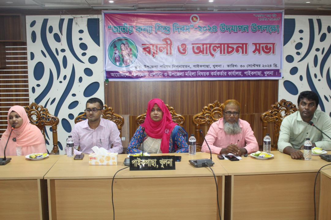 এম জালাল উদ্দীন: পাইকগাছায় জাতীয় কন্যা শিশু দিবস-২০২৪ উদযাপন উপলক্ষে র্যালি ও আলোচনা সভা অনুষ্ঠিত হয়েছে। সোমবার সকাল ১১ টায় উপজেলা পরিষদ চত্বরে উপজেলা প্রশাসন ও মহিলা বিষয়ক দপ্তর কর্তৃক আয়োজিত র্যালি শেষে উপজেলা পরিষদ মিলনায়তনে আলোচনা সভায় সভাপতিত্ব করেন উপজেলা নির্বাহী অফিসার মাহেরা নাজনীন। অনুষ্ঠানে স্বাগত বক্তব্য রাখেন উপজেলা মহিলা বিষয়ক কর্মকর্তা রেশমা আক্তার। প্রভাষক বজলুর রহমানের সঞ্চালনায় অনুষ্ঠানে অন্যান্যদের মধ্যে বক্তব্য রাখেন, বিএডিসি'র সিনিয়র সহকারী পরিচালক নাহিদুল ইসলাম, সিনিয়র উপজেলা মৎস্য কর্মকর্তা সৈকত মল্লিক, সমাজসেবা কর্মকর্তা অনাথ কুমার বিশ্বাস, পরিবার পরিকল্পনা কর্মকর্তা আব্দুল্লাহ আল মামুন, ইউআরসি ইনস্ট্রাক্টর ঈমান উদ্দিন, রেশমা খাতুন, শিউলি সরদার, কৃষ্ণা চক্রবর্তী, শিল্পী মন্ডল, জ্যোতি মন্ডল, ফাহিমা খাতুন ও পুনম সরদার প্রমুখ।