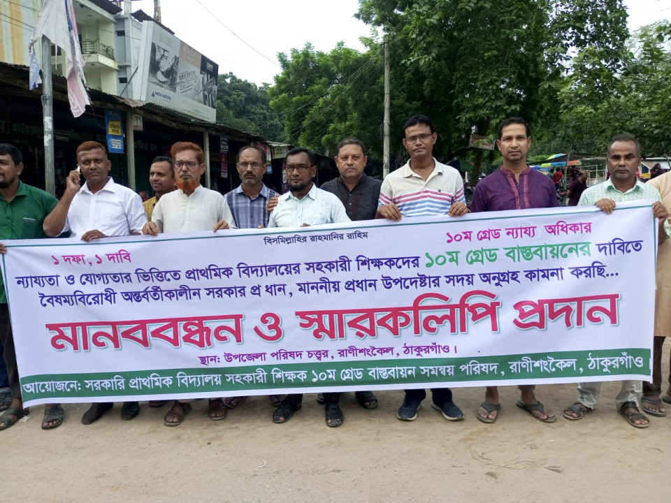 আব্দুল জব্বার : ঠাকুরগাঁওয়ের রাণীশংকৈল উপজেলা পরিষদের সামনে আজ বিকাল ৪ ঘটিকার সময় ন্যায্যতা ও যোগ্যতার ভিত্তিতে প্রাথমিক বিদ্যালয়ের সহকারী শিক্ষকদের ১০ম গ্রেড বাস্তবায়নের দাবিতে মানববন্ধন অনুষ্ঠিত হয়। উক্ত মানববন্ধন কর্মসূচিতে রাণীশংকৈল উপজেলার সকল প্রাথমিক বিদ্যালয়ের সহকারী শিক্ষক শিক্ষিকাগণ বিভিন্ন লিফলেট ব্যানারে নিয়ে উপস্থিত ছিলেন। মানববন্ধন অনুষ্ঠানে বক্তব্য রাখেন মকবুল হোসেন সহকারী শিক্ষক সহদোর সরকারি প্রাথমিক বিদ্যালয়, আজিজার বলিদ্বারা সরকারি প্রাথমিক বিদ্যালয়, ইসলাম উদ্দিন সহকারী শিক্ষক, বীরেন্দ্রনাথ রায় সহকারী শিক্ষক, কামরুজ্জামান সহকারী শিক্ষক ও দিলারা বেগম সহকারী শিক্ষিকা ভান্ডারা সরকারি প্রাথমিক বিদ্যালয়। সকল বক্তারা বৈষম্য বিরোধী অন্তবর্তী কালীন সরকারের প্রধান উপদেষ্টার দৃষ্টি কামনা করেন এবং মানববন্ধন শেষে সকল শিক্ষকগণ রাণীশংকৈল উপজেলা নির্বাহী কর্মকর্তা রকিবুল হাসান এর নিকট স্মারকলিপি প্রদান করেন।