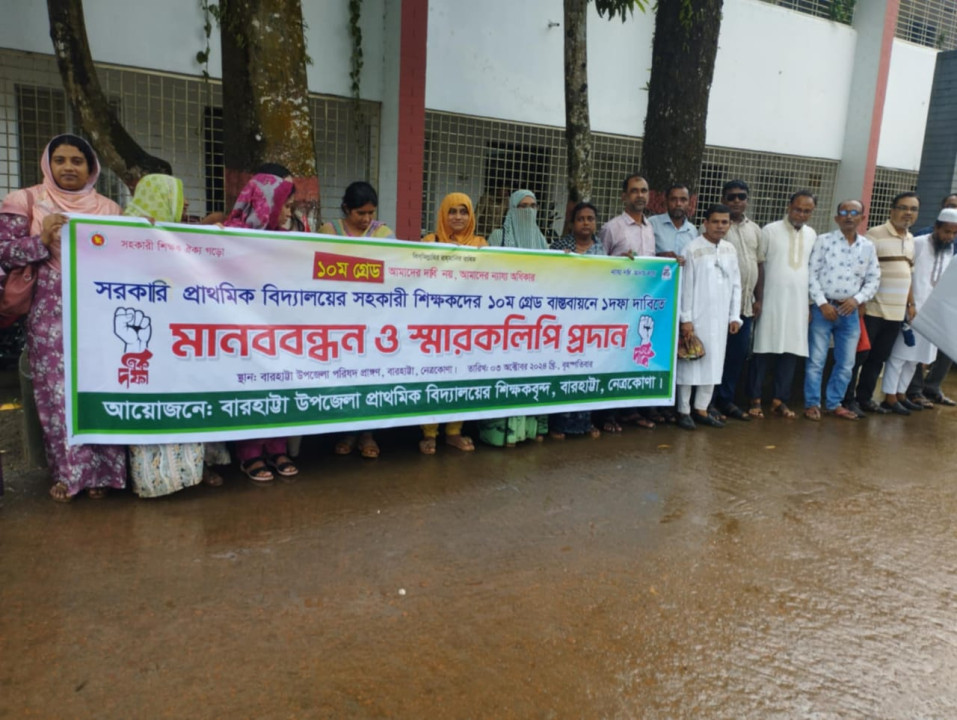 ওমর ফারুক আহম্মদ : নেত্রকোনার বারহাট্টায় সরকারি প্রাথমিক বিদ্যালয়ের সহকারী শিক্ষকদের দশম গ্রেড বাস্তবায়নের দাবিতে মানববন্ধন অনুষ্ঠিত হয়েছে।মানববন্ধনের পরে উপজেলা নির্বাহী কর্মকর্তার মাধ্যমে প্রধান উপদেষ্টা বরাবর স্মারকলিপি দেন শিক্ষকরা। বৃহস্পতিবার (৩ অক্টোবর) বিকেলে উপজেলা পরিষদ প্রাঙ্গনে এ কর্মসূচি পালন করেন তারা।এ সময় বক্তব্য দেন ইকবাল হোসেন সেক্রেটারি, বারহাট্টা উপজেলা শিক্ষক ও কর্মচারি ক্রেডিট ইউনিয়নলিমিটেড, অতিথপুর সরকারি প্রাথমিক বিদ্যালয়ের প্রধান শিক্ষক আব্দুল্লাহ আল মামুন,গোড়াউন্দ সরকারি প্রাথমিক বিদ্যালয়ের সহকারী শিক্ষক দেলোয়ার হোসেন,নতুন শেখেরপাড়া প্রাথমিক বিদ্যালয়ের সহকারী শিক্ষক হুমায়ুন কবির,কামালপুর সরকারি প্রাথমিক বিদ্যালয়ের সহকারী শিক্ষক আব্দুল্লাহ আল হারুন,দশমাধব সরকারি প্রাথমিক বিদ্যালয়ের সহকারী শিক্ষক মিহির রায় সহ প্রমুখ।বক্তারা বলেন, ‘একটি দেশে সুশিক্ষিত জাতি গঠনে প্রাথমিক শিক্ষা ভিত্তি হিসেবে কাজ করে। প্রাথমিকের শিক্ষকরা শিক্ষার সূতিকাগার হিসেবে কাজ করেন। দেশের শিক্ষাব্যবস্থায় প্রাথমিক শিক্ষকদের ভূমিকা সব থেকে বেশি। তারপরও দীর্ঘদিন ধরে সরকারি প্রাথমিক বিদ্যালয়ের সহকারী শিক্ষকদের সঙ্গে বৈষম্যমূলক আচরণ করা হচ্ছে। স্নাতক বা সমমানের যোগ্যতায় পুলিশের সাব ইন্সপেক্টর, মাধ্যমিক বিদ্যালয়ের সহকারি শিক্ষক, মন্ত্রণালয়ের প্রশাসনিক কর্মকর্তা, ডিপ্লোমাধারী নার্স, উপ-সহকারী কৃষি কর্মকর্তাদের দশম গ্রেডে বেতন দেওয়া হচ্ছে। সেখানে একই যোগ্যতা সম্পন্ন সরকারি প্রাথমিক বিদ্যালয়ের সহকারী শিক্ষকদের ১৩তম গ্রেডে বেতন দেওয়া হচ্ছে। যেখানে অষ্টম শ্রেণি পাসের একজন গাড়িচালক বেতন পায় ১২তম গ্রেডে। এ থেকেই বোঝা যায় প্রাথমিক বিদ্যালয়ের শিক্ষকরা কতটা অবহেলিত।এ সময় তারা আরও বলেন, ‘শিক্ষার ভিত্তি মজবুত করতে হলে অবশ্যই প্রাথমিক শিক্ষকদের সঠিক মর্যাদা দিতে হবে। এজন্য অনতিবিলম্বে সরকারি প্রাথমিক বিদ্যালয়ের সহকারী শিক্ষকদের দশম গ্রেড দরকার।’