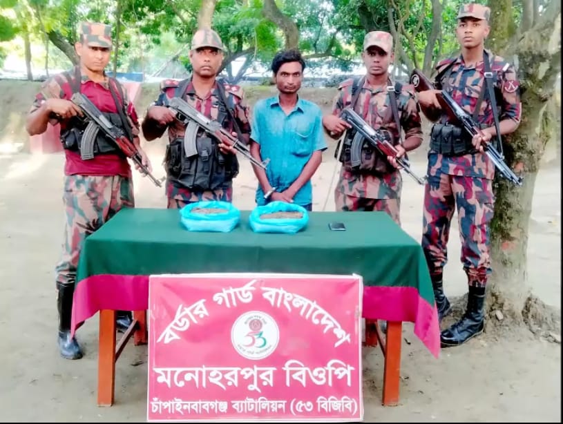 চাঁপাইনবাবগঞ্জ ব্যাটালিয়ন ৫৩ বিজিবির অভিযানে মনোহরপুর সীমান্ত হতে ভারতীয় গাঁজা সহ একজন আটক
