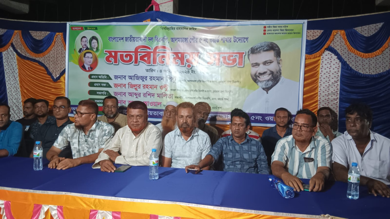 বাংলাদেশ জাতীয়তাবাদী দল বিএনপি চুয়াডাঙ্গার আলমডাঙ্গা পৌর ৫ নং ওয়ার্ড শাখার উদ্যোগে মতবিনিময় সভা অনুষ্ঠিত হয়েছে। ৪ অক্টোবর শুক্রবার সন্ধ্যা সাতটায় এরশাদপুর মকবুল মোড়ে মতবিনিময় সভা অনুষ্ঠিত হয়। মতবিনিময় সভায় আলমডাঙ্গা পৌর বিএনপির ৫ নং ওয়ার্ডের সভাপতি আব্দুর রশিদ মালিতা সভাপতিত্বে প্রধান অতিথি হিসেবে উপস্থিত ছিলেন চুয়াডাঙ্গা জেলা বিএনপির সদস্য ও আলমডাঙ্গা পৌর বিএনপির সভাপতি আজিজুর রহমান পিন্টু। এসময় বলেন, চুয়াডাঙ্গা জেলা বিএনপির সদস্য সচিব শরীফুজ্জামান শরিফের হাতকে শক্তিশালী করতে সকল নেতাকর্মিকে ঐক্যবদ্ধ হয়ে কাজ করতে হবে। দলের ভেতরে কেউ বিভ্রান্ত সৃষ্টি করবেন না। বিশেষ অতিথি হিসেবে উপস্থিত ছিলেন পৌর বিএনপি সাধারণ সম্পাদক জিল্লুর রহমান ওল্টু, যুগ্ন সাধারণ সম্পাদক মাহাবুল হক মাস্টার, মকলেছুর রহমান মিলন, সাংগঠনিক সম্পাদক আলী আজগর সাচ্চু, উপজেলা যুবদলের যুগ্ন আহবায়ক মীর উজ্জল, চৌধুরী জাহাঙ্গীর আলম বাবু, সদস্য সচিব রফিকুল ইসলাম, পৌর যুবদলের সদস্য সচিব সাইফুদ্দীন কনক, যুগ্ন আহ্বায়ক খন্দকার আঃ কাদের, হাফিজুর রহমান। ৫নং ওয়ার্ড বিএনপির যুগ্ম সম্পাদক আব্দুল আওয়ালের উপস্থাপনায় উপস্থিত ছিলেন পৌর যুবদলের সদস্য মিলন মালিতা, হারুন অর রশিদ, লিলি হোসেন, পৌর সেচ্ছাসেবক দলের সদস্য সচিব জাকারিয়া ইসলাম শান্ত, যুগ্না আহবায়ক সাজ্জাদ হোসেন সজীব, পৌর ছাত্রদলের আহবায়ক আতিক হাসান রিংকু, সদস্য সচিব মাহমুদুল হাসান তন্ময়, যুগ্না আবহবায়ক হাবিবুর রহমান রাজু, ৫নং ওয়ার্ড বিএনপি'র সহ-সভাপতি খন্দকার মতিয়ার রহমান, লিয়াকত আলী, বিএনপি নেতা ইব্রাহিম মাহমুদ, আনোয়ার, আরমান, আখতারুজ্জামান লুল, শরিফ, আওয়াল কবির, মামুন, অন্তর, মিন্টু, রেজাউল সহ পৌর ওয়ার্ড বিএনপির নেতৃবৃন্দ উপস্থিত ছিলেন।