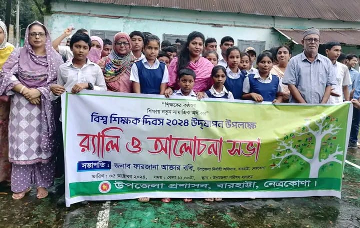 ওমর ফারুক আহম্মদ : “শিক্ষকের কন্ঠস্বর শিক্ষায় নতুন সামাজিক অঙ্গীকার” এ প্রতিপাদ্যকে সামনে রেখে নেত্রকোণার বারহাট্টায় বিশ্ব-শিক্ষক দিবস উদযাপিত হয়েছে। শনিবার উপজেলা প্রশাসনের উদ্যোগে দিবসটি উপলক্ষে র্যালি ও আলোচনা সভার আয়োজন করা হয়। র্যালিটি উপজেলা পরিষদ প্রাঙ্গন হইতে বের হয়ে উপজেলা পরিষদের অস্থায়ী হলরুমের সামনে এসে শেষ হয়। উপজেলা পরিষদ অস্থায়ী হলরুমের সামনে উপজেলা নির্বাহী অফিসার ফারজানা আক্তার ববির সভাপতিত্ব ও সঞ্চালনায় আলোচনা সভায় অন্যদের মধ্যে বক্তব্য রাখেন, ফেরদৌস আহমেদ বাবুল সাধারণত সম্পাদক বারহাট্টা প্রেসক্লাব, অতিথপুর সরকারি প্রাথমিক বিদ্যালয়ের প্রধান শিক্ষক জনাব আব্দুল্লাহ আল মামুন, বারহাট্টা পাইলট বালিকা উচ্চ বিদ্যালয়ের প্রধান শিক্ষক আবুল খায়ের আকন্দ টিটু, নিশ্চিন্তপুর উচ্চ বিদ্যালয়ের প্রধান শিক্ষক ফারুক আহম্মেদ, কাশতলা উচ্চ বিদ্যালয়ের সহকারি শিক্ষক হুমায়ুন কবীর নয়ন প্রমুখ। এছাড়াও উপজেলার বিভিন্ন বিদ্যালয়ের শিক্ষক ও শিক্ষার্থীসহ প্রিন্ট ও ইলেকট্রনিক্স মিডিয়ার সাংবাদিকবৃন্দ উপস্থিত ছিলেন।