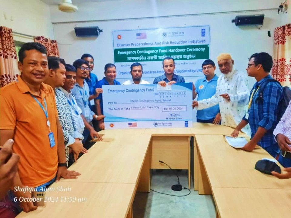 জামাল উদ্দীন : দুর্যোগ মোকাবেলায় তহবিল গঠনের লক্ষ্যে চেক হস্তান্তর সভা ৬ অক্টোবর (সোমবার)টেকনাফ উপজেলা নির্বাহী অফিসারের সম্মেলন কক্ষে দূর্যোগ মোকাবেলায় তহবিল গঠনের লক্ষ্যে চেক হস্তান্তর সভা অনুষ্ঠিত হয়।উক্ত অনুষ্ঠানে ইউএনডিপি’র অর্থায়নে ও কারিগরী সহযোগিতায় এবং গণ উন্নয়ন কেন্দ্র (জিইউকে) কর্তৃক বাস্তবায়নাধীন ডিপিআরআর প্রকল্পের পক্ষ থেকে দূর্যোগ মোকাবেলায় গঠিত তহবিলে ১৫ লক্ষ টাকার একটি চেক হস্তান্তর করা হয়। ইউএনডিপি-জিইউকের পক্ষে নীহার দাস ও এটিএম ফেরদৌস টেক্নাফ উপজেলা নির্বীহী অফিসার মোঃআদনান চৌধুরীর হাতে ১৫ লাখ টাকার একটি চেক হস্তান্তর করা হয়। এ সময় উপস্থিত ছিলেন, টেকনাফ উপজেলার পিআইও মোঃ হাবীবু রহমান,উপজেলা সমাজ সেবা কর্মকর্তা মোঃ খোরশেদ আলম, জিইউকের পক্ষ থেকে শফিকুল আলম, মনিটরিং অফিসার, আ্ান হাবিব চৌধুরী, প্রজেক্ট ইঞ্জিয়ার সহ স্থানীয় গণ্যমাণ্য ব্যক্তিবর্গ উপস্থিত ছিলেন।উক্ত তহবিলের অর্থ দ্বারা টেকনাফ উপজেলায় দূর্যোগকালীন সময়ে জরুরী ত্রাণ নিশ্চিত করা যাবে। উপজেলা নির্বাহী অফিসার জিইউকে এবং ইউএনডিপি কর্তৃপক্ষকে ধন্যবাদ জ্ঞাপন করেন এবং অন্যান্য উন্নয়ন সহযোগী প্রতিষ্ঠানকে এই তহবিলে অর্থ সহযোগিতার জন্য আহবান জানান