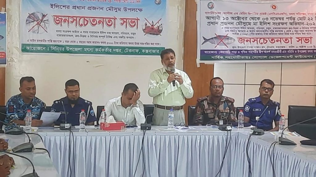 জামাল উদ্দীন : “ইলিশ বাংলাদশের গর্ব,আমাদের জাতীয় সম্পদ এ সম্পদ রক্ষা করা আমাদের সকলের দায়িত্ব”এ প্রতিপাদ্যকে সামনে রেখে সারা দেশের ন্যায় টেকনাফেে ১৩ অক্টোবর-২৪ থেকে ৩ নভেম্বর পর্যন্ত ২২ দিন ইলিশের প্রধান প্রজনন মৌসুম উপলক্ষে জন সচেতনতামূলক সভা ১০ নভেম্বর (বৃহস্পতিবার)সকাল ১১ টায় উপজেলা পরিষদ মিলনায়তনে অনুষ্ঠিত হয়।উপজেলা সিনিয়র মৎস্য কর্মকর্তার দপ্তর কর্তৃক আয়োজিত টেকনাফ উপজেলা নির্বাহী অফিসার মোঃ আদনান চৌধুরীর সভাপতিত্বে সরকার ঘোষিত ২২ দিন সারাদেশে ইলিশ আহরণ,পরিবহন,মওজুদ, বাজারজাতকরণ,ক্রয় বিক্রয় ও বিনিময় সম্পূর্ণ নিষিদ্ধ এবং দন্ডনীয় অপরাধ বিষয়ে স্বাগত বক্তব্য রাখেন, উপজেলা সিনিয়র মৎস্য কর্মকর্তা মোঃ দেলোয়ার হোসেন।উপজেলা সহকারী মৎস্য অফিসার শহীদুল আলমের সঞ্চালনায় এবং সাংবাদিক মোঃআশেক উল্লাহ ফারুকীর পবিত্র কোরআন তেলাওয়াতের মধ্য দিয়ে অনুষ্ঠানে “মা”ইলিশ সংরক্ষণ অভিযান বিষয়ের উপর বক্তব্য রাখেন,টেকনাফ মডেল থানার পুলিশ অফিসার মোঃ হেলাল উদ্দিন,টেকনাফ ২ বিজিবি টেকনাফ পৌরসভার বিউপির সুবেদার হায়দারুল ইসলাম,এসআই নজরুল ইসলাম খোন্দকার,নৌপুলিশ অফিসার মোঃ মনিরুল ইসলাম,কোস্ট গার্ড প্রতিনিধি মহি উদ্দীন শামীম,সাংবাদিক মোঃ আশেক উল্লাহ ফারুকী,টেকনাফ উপজেলা বোট মালিক সমিতির সভাপতি ও সাধারন সম্পাদক আব্দুল মোমিন ও আবুল কালাম ও মৎস্যজীবী জেলে আব্দুস সালাম।সভাপতি উপজেলা নির্বাহী অফিসার সমাপনী বক্তব্যে বলেন, দেশের অর্থনৈতিক চালিকা শক্তির একাংশ মৎস্যজীবী জেলে সম্প্রদায়।এরা জীবনের ঝুঁকি উপেক্ষা করে জীবিকা অর্জন এবং বিপননে সাগরে মাছ আহরণে করে আসছে। ওদের অবদান আমাদের জন্য প্রেরণার উৎসব। এর সাথে জাতীয় মৎস্য আইনের প্রতি শ্রদ্ধাশীল হতে হবে। সভায় উপস্থিত ছিলেন,বোট মালিক সমিতির সভাপতি,সাধারণ সম্পাদক, মৎস্যজীবী জেলে সম্প্রদায়, সাংবাদিক, বিজিবি, পুলিশ, নৌ পুলিশ সহ সরকারি কর্মকর্তা, কর্মচারী।