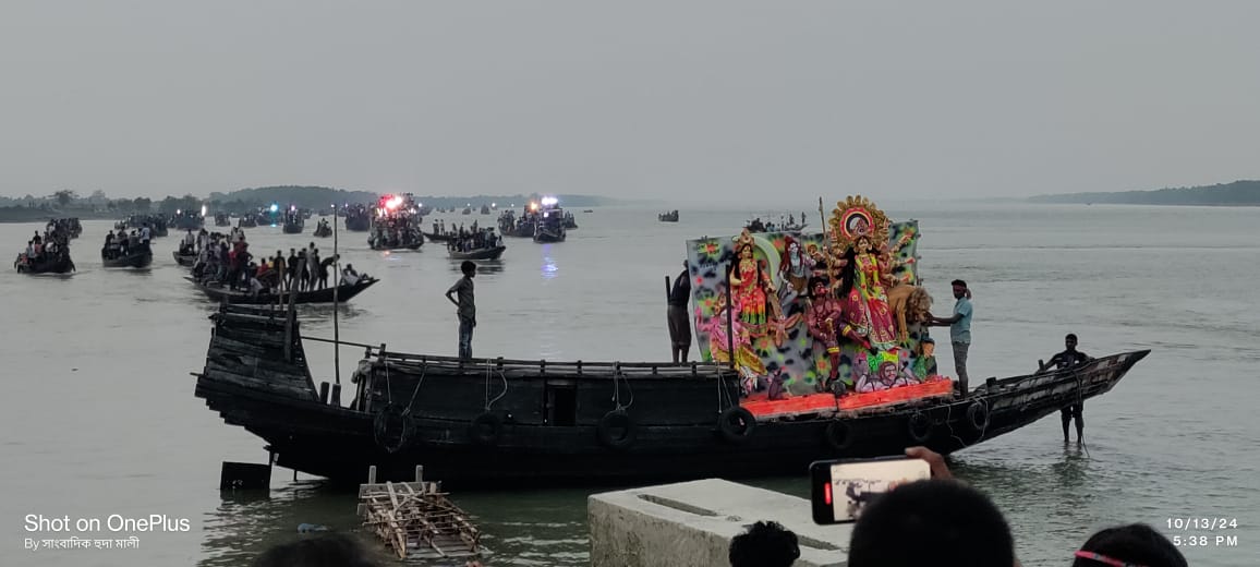 আল-হুদা মালী, শ্যামনগর প্রতিনিধি : সনাতন ধর্মাবলম্বীদের সবচেয়ে বড় ধর্মীয় উৎসব শারদীয় দুর্গা পূজার বিজয়া দশমী উপলক্ষে দুর্গা প্রতিমা বিসর্জন অনুষ্ঠান অনুষ্ঠিত হয়েছে। রবিবার ১৩ অক্টোবর বিকালে দ্বিতীয় টাকি নামে খ্যাত সাতক্ষীরার শ্যামনগর উপজেলার খোলপেটুয়া নদীতে হিন্দু ধর্মালম্বীদের দেবী দূর্গা প্রতিমার বিসর্জনের মধ্য দিয়ে শারদ উৎসব হয়। গাবুরা, বুড়িগোয়ালিনী,পদ্মপুকুর ও আটুলিয়া ইউনিয়নের কয়েকটি মন্ডপের প্রতিমা নিয়ে শত শত নৌকা দর্শনার্থীসহ বাদ্য বাজনা সহকারে খোলপেটুয়া নদীতে প্রতিমা বিসর্জনে অংশ নেয়। এ ছাড়া খোলপেটুয়া নদীর উভয়পাড়ে হাজার হাজার দর্শনার্থী প্রতিমা বিসর্জনে অংশ গ্রহণ করেন। শত শত নারীরা উলু ধ্বনী ও দূর্গা মায়ের সিঁথিতে সিঁদুর পরিয়ে দেবী দূর্গাকে বিসর্জনের জন্য বিদায় জানায় খোলপেটুয়া নদীর পাড়ে বুড়িগোয়ালিনী এলাকায় প্রতিমা বিসর্জন উৎসবে অতিথি হিসাবে অংশ গ্রহণ করেন, শ্যামনগর উপজেলা নির্বাহী কর্মকর্তা, ডা. সঞ্জীব দাশ, উপজেলা প্রকল্প বাস্তবায়ন কর্মকর্তা মো: শাহিনুল ইসলাম, শ্যামনগর উপজেলা পূজা উদযাপন পরিষদের সাধারণ সম্পাদক এডভোকেট কৃষ্ণপদ মন্ডল, বুড়িগোয়ালিনী ইউনিয়ন পরিষদের চেয়ারম্যান আলাজ নজরুল ইসলাম, প্যানেল চেয়ারম্যান, জি,এম আব্দুর রউফ, বুড়িগোয়ালিনী ৮নং ওয়ার্ডের ইউপি সদস্য রবিউল ইসলাম, উপকূলীয় প্রেসক্লাবের সভাপতি আব্দুল হালিম, শ্যামনগর উপজেলা যুবদলের সাবেক, যুগ্ন সাধারন সম্পাদক ও বুড়িগোয়ালিনী ইউনিয়ন পরিষদের চেয়ারম্যান পদপ্রার্থী জি,এম রুস্তম আলী,শ্যামনগর উপজেলা ছাত্রদলের যুগ্ম আহ্বায়ক আব্দুস সালাম, বুড়িগোয়ালিনী ইউনিয়ন যুবদলের সদস্য সচিব হেলাল,সিনিয়র যুগ্ম আহ্বায়ক আল মামুন সহ আরো অনেকে। উপজেলা নির্বাহী কর্মকর্তা, ডা. সঞ্জীব দাস জানান, দুপুরের পর থেকে প্রতিমা বিসর্জন দেওয়ার জন্য প্রত্যেক পূজা মণ্ডপ থেকে প্রতিমা বের করার কাজ শুরু হয়। মণ্ডপ থেকে প্রতিমা ভ্যান, মিনি ট্রাক ও অন্যান্য যানবাহনযোগে বিসর্জন স্থানে নিয়ে যাওয়া হয়। প্রতিবছরের ন্যায় এ বছরেও উপজেলার বিভিন্ন প্রতিমা, মন্ডপের পার্শ্ববর্তী বড় জলাশয়ে এবং বেশিরভাগ প্রতিমা ঐতিহ্যবাহী খোলপেটুয়া নদীতে নৌকা ও ট্রলার যোগে দূর্গাবাটি, ঝাঁপা, বড় কুপট, কামাল কাটি, নওয়াবেঁকী, বুড়িগোয়ালিনী, আড়পাংগাশিয়া, দুরমুজখালি সহ বিভিন্ন ইউনিয়নে অন্যান্য স্থানের প্রতিমা বিসর্জন করা হয়। বুড়িগোয়ালিনী ইউনিয়ন পরিষদের চেয়ারম্যান আলহাজ্ব নজরুল ইসলাম জানান, কোন প্রকার অপ্রীতিকর ঘটনা ছাড়াই বিভিন্ন স্থানের প্রতিমা বিসর্জন দেওয়া হয়েছে। সকলের সহযোগিতায় সুষ্ঠু ও সফলভাবে শারদীয়া দুর্গাপূজা উদযাপন এবং ব