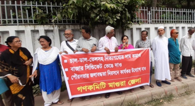 তৌহিদ,সহসম্পাদক : চাল-ডাল-তেলসহ নিত্য প্রয়োজনীয় পণ্যের দাম কমানো, বাজার সিন্ডিকেট ভেঙে দেওয়া এবং পৌরসভার জলাবদ্ধতা নিরসনে কার্যকর উদ্যোগ নেওয়ার দাবিতে মাগুরা জেলা গণকমিটির উদ্দ্যোগে সমাবেশ অনুষ্ঠিত হয়েছে। বুধবার ১৬ ই অক্টোবর সকাল ১১টায় চৌরঙ্গী মোড়ে ও মাগুরা জেলা প্রেসক্লাবের সামনে সমাবেশটি অনুষ্ঠিত হয়। গণকমিটির আহ্বায়ক এটিএম মহব্বত আলীর সভাপতিত্বে এবং সদস্য সচিব প্রকৌশলী শম্পা বসুর পরিচালনায় সমাবেশে বক্তব্য প্রদান করেন, গণকমিটি মাগুরা জেলার যুগ্ম আহ্বায়ক শিক্ষাবিদ কাজী নজরুল ইসলাম ফিরোজ, অন্যতম সদস্য মশিউর রহমান ও বাসারুল হায়দার বাচ্চু।