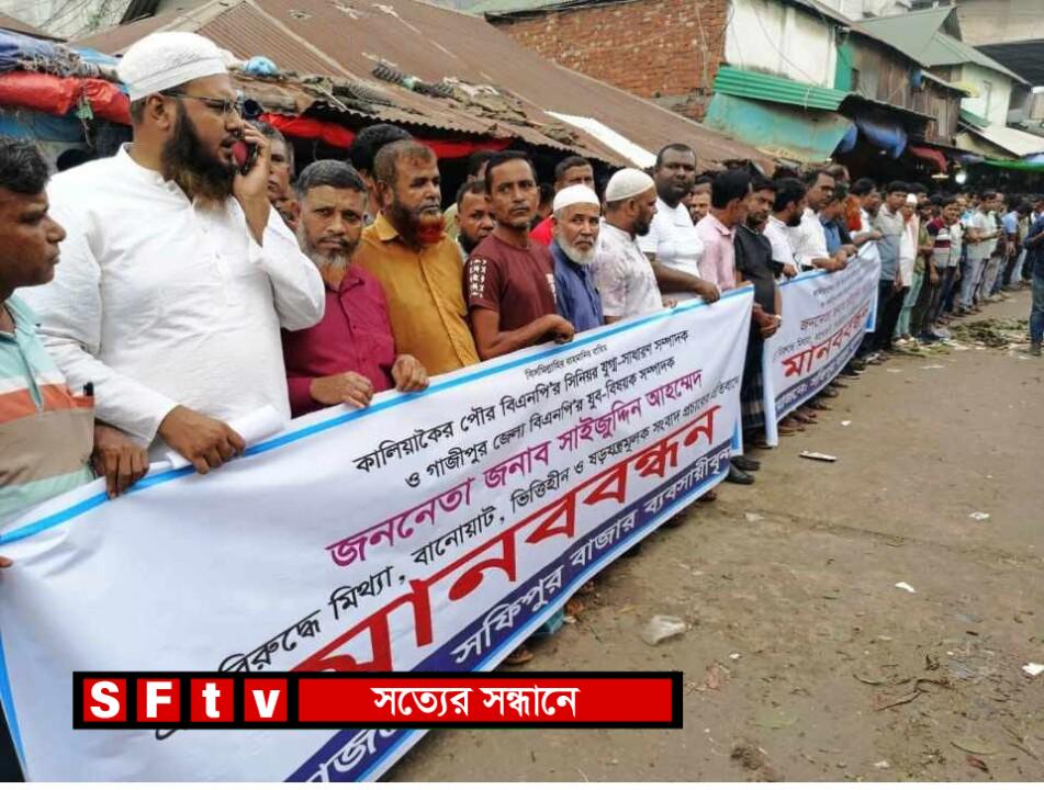 গাজীপুরের কালিয়াকৈর পৌর বিএনপির সিনিয়র যুগ্ম-সম্পাদক সাইজউদ্দিন আহম্মেদকে নির্দোষ দাবি করে তার পক্ষে মানবন্ধন করেছেন ব্যবসায়ীরা। শুক্রবার সকালে উপজেলার সফিপুর বাজার ব্যবসায়ী সমিতির আয়োজনে এ মানববন্ধন অনুষ্ঠিত হয়।ঐতিহ্যবাহী সর্ববৃহৎ ব্যাবসায়ী সমিতির সূত্রে জানা গেছে, গত কয়েকদিন ধরে বিএনপি নেতা সাইজউদ্দিন আহম্মেদের নামে জমি দখল ও ঝুট ব্যাবসা নিয়ন্ত্রণ সংক্রান্ত অনলাইন নিউজ পোর্টালসহ কয়েকটি সংবাদপত্রের সংবাদ,সামাজিক যোগাযোগ মাধ্যমে ঘুরপাক খাচ্ছে। উল্লেখিত সংবাদ মিথ্যা, বানোয়াট, ভিত্তিহীন দাবী ও এর প্রতিবাদে সকালে মানববন্ধন করেন সফিপুর বাজারের সকল ব্যবসায়ীরা। এসময় তারা জানিয়েছেন, বর্তমান সময়ে উপজেলায় অত্যান্ত জনপ্রিয় আমাদের নেতাকে সামাজিক ও রাজনৈতিক ভাবে হেয় প্রতিপন্ন এবং হয়রানি করতে ষড়যন্ত্রমুলক ভাবে তার বিরুদ্ধে মিথ্যা ভিত্তিহীন সংবাদ প্রকাশ করিয়েছেন আওয়ামী ফ্যাসিবাদের দোসররা। তারা গোপনে দীর্ঘদিনের কামানো অবৈধ টাকা ছড়িয়ে শুধু সাইজদ্দিন নয় বিএনপিরও বদনাম করার চেষ্টা করছেন। মানববন্ধনে বক্তব্য রাখেন- সফিপুর বাজার ব্যবসায়ী সমিতির সাধারন সম্পাদক মোতালেব হোসেন, বাজার কমিটির সদস্য ফজলুর রহমান, বাজারের ব্যবসায়ী হাজী আব্দুল আজিজ, আওয়াল মোল্লা, মো. শাহ আলম ও সফিকুল ইসলামসহ আরো অনেকে। এসময় উপস্থিত ছিলেন- সফিপুর বাজার সমিতির পরিচালনা কমিটির সদস্য,ব্যবসায়ীসহ শত শত মানুষ।