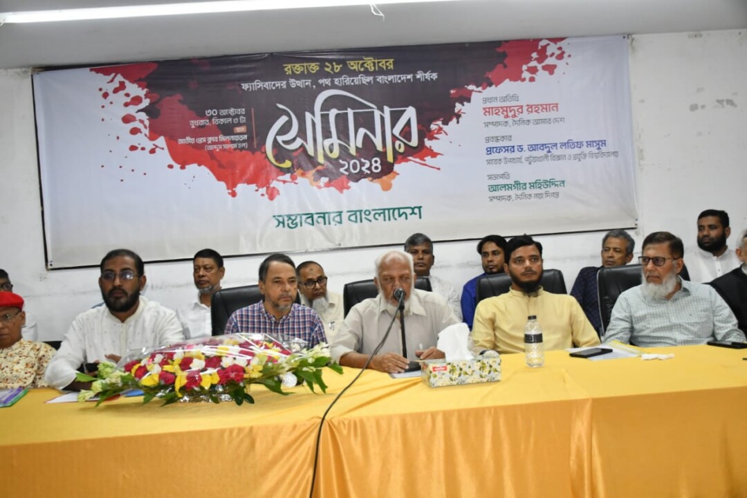 ৩০ অক্টোবর (বুধবার) জাতীয় প্রেসক্লাবে সম্ভাবনার বাংলাদেশ আয়োজিত সেমিনারে অতিথির বক্তব্যে তিনি এসব কথা বলেন। জাতীয় প্রেসক্লাবের আব্দুস সালাম হলে “রক্তাক্ত ২৮ অক্টোবর: ফ্যাসিবাদের উত্থান; পথ হারিয়েছিল বাংলাদেশ” শীর্ষক সেমিনার অনুষ্ঠিত হয়েছে। দৈনিক নয়াদিগন্ত পত্রিকার সম্পাদক আলমগীর মহিউদ্দিনের সভাপতিত্বে ও সম্ভাবনার বাংলাদেশ সংগঠনের সেক্রেটারি ড. মুহাম্মদ আবদুল মান্নানের পরিচালনায় উক্ত সেমিনারে প্রবন্ধ উপস্থাপন করেন পটুয়াখালী বিজ্ঞান ও প্রযুক্তি বিশ্ববিদ্যালয়ের সাবেক উপাচার্য অধ্যাপক ড. আবদুল লতিফ মাছুম। অন্যানের মধ্যে বক্তব্য রাখেন – ঢাকা বিশ্ববিদ্যালয়ের অধ্যাপক ড. প্রফেসর ওয়ারেসুল আলম বুলবুল, লেবার পার্টির চেয়ারম্যান ডা. মুস্তাফিজুর রহমান ইরান, কবি আব্দুল হাই শিকদার, বাংলাদেশ ফেডারেল সাংবাদিক ইউনিয়নের মহাসচিব কাদের গণি চৌধুরী, ঢাকা সাংবাদিক ইউনিয়নের সভাপতি শহীদুল ইসলাম, কর্নেল আব্দুল হক, সুপ্রিম কোর্টের আইনজীবী ব্যারিস্টার মো. বেলায়েত হোসেন, প্রকৌশলী শেখ আল আমিন, এডভোকেট রেজাউল করিম প্রমুখ। সেমিনারে বক্তারা বলেন, ২০০৬ সালের ২৮ অক্টোবর ফ্যাসিবাদ আওয়ামী লীগের যতটা বর্বরতা দেখেছি, মুক্তিযুদ্ধে পাক-হানাদার বাহিনীর ততটা বর্বরতা দেখিনি। অনুষ্ঠানে সুপ্রিম কোর্টের আইনজীবী ব্যারিস্টার মো. বেলায়েত হোসেন বলেন, রাষ্ট্রপতির পদত্যাগে কোন সাংবিধানিক সংকট সৃষ্টি হবে না। রাষ্ট্রপতি এরশাদ উপরাষ্ট্রপতির কাছে পদত্যাগ পত্র জমা দিয়েছেন। এখন যেহেতু উপরাষ্ট্রপতি পদ নাই সেহেতু রাষ্ট্রপতি জনগণের কাছে পদত্যাগ জমা দিবেন। জনগণের প্রতিনিধি হচ্ছে সরকার। সুতারাং রাষ্ট্রপতি অন্তর্বতীকালীন সরকারের প্রধান উপদেষ্টা ড. মুহাম্মদ ইউনূসের কাছে পদত্যাগপত্র জমা দিতে পারে। এছাড়া বক্তারা সকলেই রাষ্ট্রপতির পদত্যাগ দাবি করেন। তিনি ২৮ অক্টোবর ২০০৬ থেকে ০৫ আগস্ট ২০২৪ পর্যন্ত আওয়ামী লীগ কর্তৃক সংঘটিত সকল হত্যাকান্ডের বিচার কার্যক্রম শুরু করতে অন্তবর্তীকালীন সরকারের কাছে দাবি জানান। সেমিনারে বক্তারা আরও বলেন, আওয়ামী লীগ মূলত চেয়েছে জামায়াত-বিএনপির ঐক্যের ফাটল ধরাতে। তারা জানত এটি করতে পারলেই তারা ক্ষমতা দখল করতে পারবে। কারণ জামায়াত-বিএনপি জোটগতভাবে নির্বাচন করলে আওয়ামী লীগ ক্ষমতাতো দূরের কথা কখনো বিরোধী দলের আসনেও সংসদে বসতে পারবে না। সেজন্য তারা ২৮ অক্টোবর সৃষ্টি করেছে। সেদিন তারা মশাল হাতে নিয়ে এসেছে জামায়াত-শিবিরের অফিস পুড়িয়ে দিয়ে ভয়ভীতি প্রদর্শন করে দেশবাসীকে নিজেদের কব্জায় রাখতে।