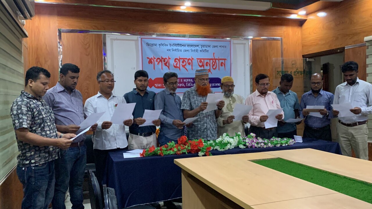চুয়াডাঙ্গায় ডিপ্লোমা কৃষিবিদ ইনস্টিটিউশনের নবনির্বাচিত কমিটির শপথ গ্রহণ অনুষ্ঠিত হয়েছে, সোমবার ৪ এ নভেম্বর বিকেল ৪ টার সময় চুয়াডাঙ্গা কৃষি সম্প্রসারণ অধিদপ্তরের হলরুমে এ শপথ গ্রহণ অনুষ্ঠিত হয়, শপথ গ্রহণ অনুষ্ঠানে ডিপ্লোমা কৃষিবিদ ইনস্টিটিউশনের চুয়াডাঙ্গা জেলা শাখার রিটার্নিং অফিসার মোঃ আব্দুল মান্নান সকল নির্বাচিত প্রতিনিধিদের শপথ বাক্য পাঠ করান।