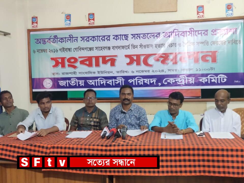 সাগর কুমার সিং : জাতীয় আদিবাসী পরিষদ কেন্দ্রীয় কমিটির আয়োজনে আজ ৬ নভেম্বর ২০২৪, বুধবার, বেলা ১২টায় রাজশাহী সাংবাদিক ইউনিয়নের হল রুমে অন্তর্বর্তীকালীন সরকারের কাছে সমতলের আদিবাসীদের প্রত্যাশা ও ৬ নভেম্বর ২০১৬ গাইবান্ধা গোবিন্দগঞ্জের সাহেবগঞ্জ বাগদাফার্মে তিন সাঁওতাল হত্যার বিচার ও পৈত্রিক সম্পত্তি ফেরতের দাবিতে “সংবাদ সম্মেলন” অনুষ্ঠিত হয়েছে।