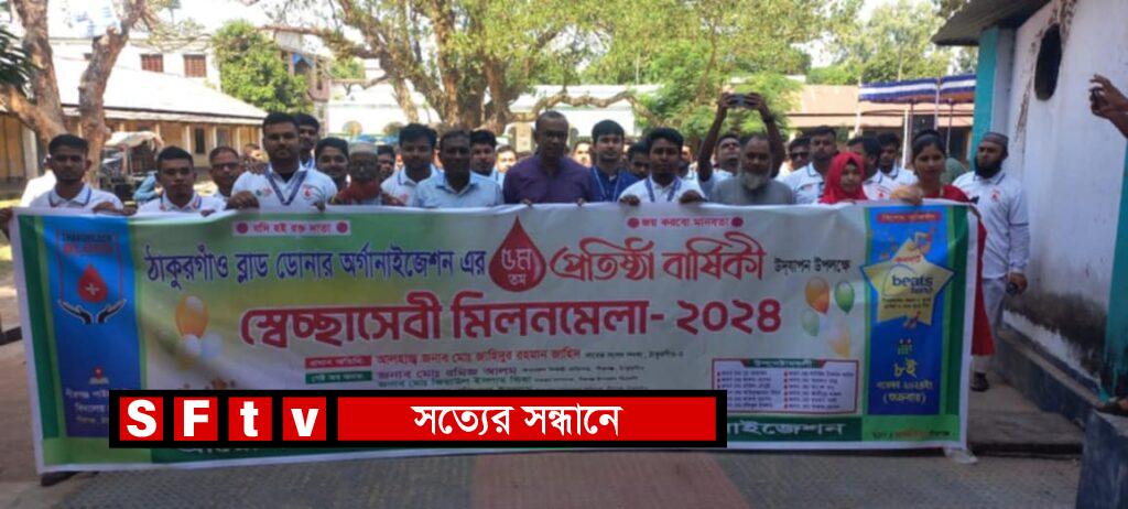 সাকিব আহসান : স্বেচ্ছায় রক্তদান সংগঠন ঠাকুরগাও ব্লাড ডোনার অর্গানাইজেশনের ৫ম প্রতিষ্ঠা বার্ষিকী উপলক্ষে মিলন মেলা হয়েছে। পীরগঞ্জ পাইলট উচ্চ বিদ্যালয় প্রাঙ্গনে শুক্রবার দিন ব্যাপী এ মিলন মেলা হয়। সকালে পাইলট উচ্চ বিদ্যালয় থেকে র্যালী বের করা হয়। শহর ঘুড়ে আবার বিদ্যালয় প্রাঙ্গনে এসে র্যালী শেষ হয়। পরে সেখানে আলোচনা সভায় বক্তব্য দেন, সাবেক এমপি জাহিদুর রহমান, সাবেক উপজেলা চেয়ারম্যান জিয়াউল ইসলাম জিয়া, জেলা সিপিবির সাধারণ সম্পাদক অ্যাড. আবু সায়েম, পীরগঞ্জ প্রেসক্লাবের সভাপতি জয়নাল আবেদিন বাবুল, পৌর বিএনপির সহ সভাপতি আসাদুজ্জামান চৌধুরী মানু, সাংবাদিক মোকাদ্দেস হায়াত মিলন, সংগঠনের উপদেষ্টা শাহিনুর রহমান, প্রতিষ্ঠাতা পরিচালক উজ্জল রহমান, সভাপতি সুজন রাফি প্রমূখ। এতে সংগঠনের সদস্য, সাংবাদিক ও গন্যমান্য ব্যক্তিবর্গ উপস্থিত ছিলেন। বিকালে কেক কাটা, ক্রেস্ট বিতরণ ও সাংস্কৃতিক অনুষ্ঠানের আয়োজন করা হয়।