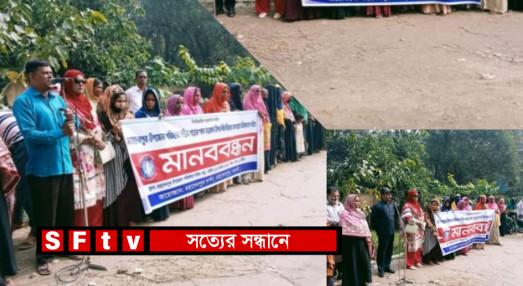 উজ্জ্বল কুমার সরকার : নওগাঁর মহাদেবপুর উপজেলা পরিষদ কমপেস্নঙ্রে সামনে প্রধান পাকা সড়কের উপরের জলাবদ্ধতা নিরসনের দাবিতে মানববন্ধন অনুষ্ঠিত হয়েছে। বৃহস্পতিবার (১৪ নভেম্বর) বেলা ১১টা থেকে দুপুর ১টা পর্যন্ত্ম অনুষ্ঠিত মানববন্ধনে উপজেলার বিভিন্ন এলাকার প্রায় দুশ’ নারীসহ অসংখ্য জনতা স্বতঃস্ফুর্তভাবে অংশ নেন। মহাদেবপুর থেকে প্রকাশিত জনপ্রিয় অনলাইন “মহাদেবপুর দর্পণ” পরিবার এর আয়োজন করে।