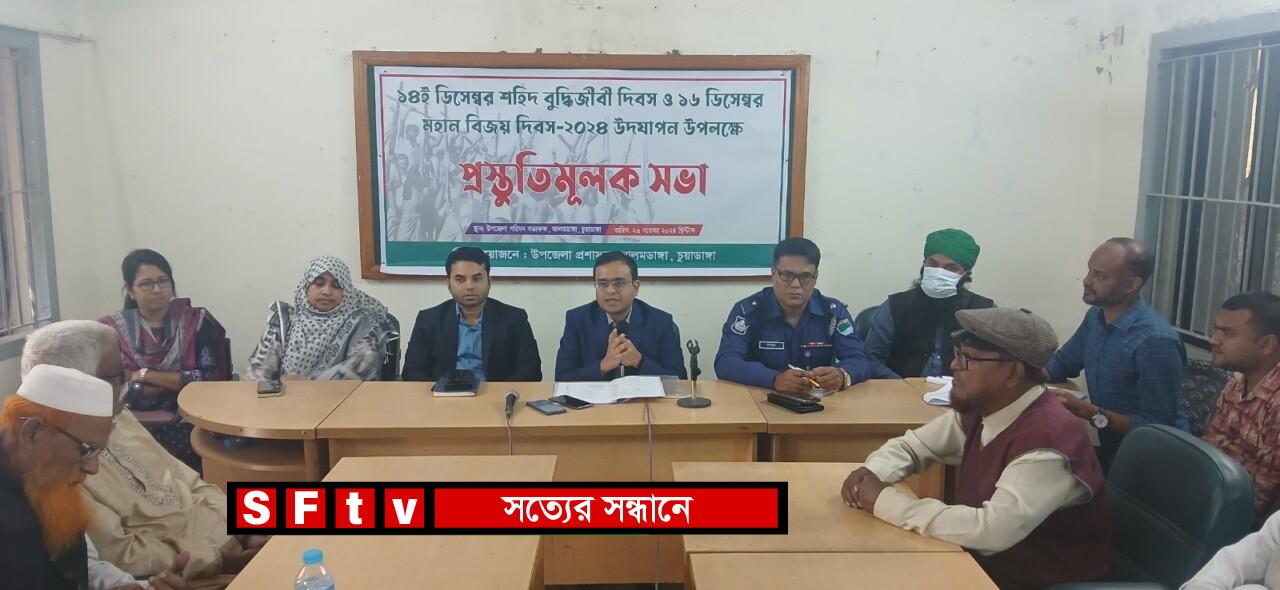 আলমডাঙ্গায় ১৪ ডিসেম্বর শহিদ বুদ্দিজীবী দিবস ও ১৬ ডিসেম্বর মহান বিজয় দিবস-২০২৪ উৎযাপন উপলক্ষে প্রস্তুতি সভা অনুষ্ঠিত হয়েছে। ২৬ নভেম্বর মঙ্গলবার সকালে উপজেলা পরিষদ হলরুমে প্রস্তুতি সভা অনুষ্ঠিত হয়। প্রস্তুতি সভায় উপজেলা নির্বাহী অফিসার শেখ মেহেদী ইসলামের সভাপতিত্বে উপস্থিত ছিলেন উপজেলা সহকারি কমিশনার (ভ‚মি) আশীষ কুমার বসু, আলমডাঙ্গা থানার অফিসার ইনচার্জ মাসুদুর রহমান, প্রাণী সম্পদ কর্মকর্তা এসএম মাহমুদুল হক, কৃষি কর্মকর্তা রেহানা পারভীন, উপজেলা স্বাস্থ্য কমপ্লেক্সের আবাসিক মেডিকেল অফিসার নাজনীন সুলতানা কনা, পরিবার পরিকল্পনা কর্মকর্তা এএস শাহরিয়ার মাহমুদ, বীর মুক্তিযোদ্ধা এম সবেদ আলী, বীর মুক্তিযোদ্ধা আবুল কাসেম মাস্টার, বীর মুক্তিযোদ্ধা ও সাবেক উপজেলা চেয়ারম্যান হেলাল উদ্দিন, বীর মুক্তিযোদ্ধা ওয়াজেদ আলী মাস্টার, বীর মুক্তিযোদ্ধা শফি উদ্দিন, উপজেলা বিএনপির সহসভাপতি আক্তার হোসেন জোয়ার্দ্দার, সাধারন সম্পাদক আমিনুল হক রোকন, উপজেলা জামায়াতের আমির প্রভাষক শফিউল আলম বকুল, জেলা জামায়াতের আইন ও আদালত বিষয়ক সম্পাদক দারুস সালাম, পৌর বিএনপির সভাপতি আজিজুর রহমান পিন্টু, সাধারন সম্পাদক জিল্লুর রহমান ওল্টু, ইউপি চেয়ারম্যা মিনাজ উদ্দিন, শেখ আশাদুল হক মিকা, বৈষম্য বিরোধী আন্দোলনের শিক্ষার্থীদের মধ্যে কামরুজ্জামান কাজল, রাকিব আহমেদ, আলমডাঙ্গা মহিলা ডিগ্রী কলেজের অধ্যক্ষ আশুরা খাতুন পাতা, পাইলট মাধ্যমিক বালিকা বিদ্যালয়ের প্রধান শিক্ষক মনিরুজ্জামান, এরশাদপুর একাডেমির প্রধান শিক্ষক ফজলুল হক শামীম, এমসবেদ আলী মাধ্যমিক বিদ্যালয়ের প্রধান শিক্ষক সিদ্দীকুর রহমান, উপজেলা শিক্ষা অফিসার আলা উদ্দিন, মাধ্যমিক শিক্ষা অফিসার জিয়াউল হক, একাডেমি সুপারভাইজার ইমরুল হক, সমাজনেবা অফিসার সাজ্জাদ হোসেন, আইসিটি কর্মকর্তা মোস্তাফিজুর রহমান, নির্বাচন কর্মকর্তা শেখ মাসুদ বিল্লাহ, উপজেলা রিসোর্চ সেন্টারের ইন্সটেক্টর জামাল হোসেন, আনসার ভিডিপি কর্মকর্তা আজিজুল হাকীম, আলমডাঙ্গা ফায়ার সার্ভিস ষ্টেশন অফিসার আল মামুন, উপজেলা সহকারি যুবউন্নয়ন কর্মকর্তা জহুরুল ইসলাম প্রমুখ।