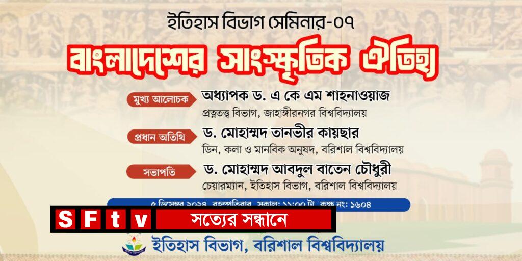বরিশাল বিশ্ববিদ্যালয়ের ইতিহাস বিভাগের আয়োজনে বাংলাদেশের সাংস্কৃতিক ঐতিহ্য বিষয়ক সেমিনার অনুষ্ঠিত হয়েছে।