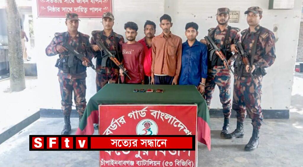 ৫ ডিসেম্বর ২০২৪ তারিখ চাঁপাইনবাবগঞ্জ ব্যাটালিয়ন (৫৩ বিজিবি) এর অধীনস্থ ফতেপুর বিওপির একটি বিশেষ টহলদল টহল পরিচলনা করার সময় দুপুর ১২টা ১০ মিনিটে সীমান্ত পিলার ১৩/১-এস এর নিকট দিয়ে ০৪ জন ব্যক্তিকে ভারত হতে বাংলাদেশে আসতে দেখে তাদের চ্যালেঞ্জ করলে তারা দৌড়ে পালানোর চেষ্টা করে। পরবর্তীতে টহলদল তাদেরকে ধাওয়া করে আটক করতে সক্ষম হয়। জিজ্ঞাসাবাদে জানা যায় আটককৃত ব্যক্তি (ক) মোঃ নুহ নবী (৩৫), পিতা-মোঃ ফজলু, (খ) মোঃ সুমন (৩০), পিতা-পারুল আলী, (গ) মোঃ এম (২৬), পিতা-মোঃ আঃ মালেক সকলের গ্রাম-রাণীনগর হাটপাড়া এবং (ঘ) মোঃ সুজন শেখ (২৭), পিতা-নুরুল ইসলাম, গ্রাম-সাহাপাড়া, উপরোক্ত সকলের পোষ্ট-মনাকষা, থানা-শিবগঞ্জ, জেলা-চাঁপাইনবাবগঞ্জ গত ০৪ ডিসেম্বর ২০২৪ তারিখ গরু ও মাদক চোরাচালানের উদ্দেশ্যে অবৈধভাবে ভারতে প্রবেশ করেছিল। আটককৃত ব্যাক্তিদের তল্লাশী করে তাদের ব্যবহৃত ০৪টি মোবাইল ফোন পাওয়া যায়। আটককৃত ব্যক্তিদের শিবগঞ্জ থানায় হস্তান্তর করার কার্যক্রম প্রক্রিয়াধীন।