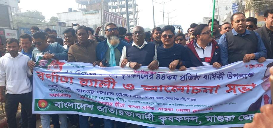 বাংলাদেশ জাতীয়তাবাদী কৃষকদলের ৪৪তম প্রতিষ্ঠা বার্ষিকী উপলক্ষে মাগুরাতে বর্ণাঢ্য র্যালি ও আলোচনা সভা অনুষ্ঠিত হয়েছে। বুধবার ১১ ডিসেম্বর সকাল ১১ টায় শহরের ভায়না মোড়স্থ বিএনপি অফিসের সামনে পতাকা উত্তোলনের মধ্য দিয়ে প্রতিষ্ঠা বার্ষিকীর কর্মকাণ্ড শুরু হয়। পরে অফিস চত্বর থেকে বর্ণাঢ্য শোভাযাত্রা বের হয়। এসময় বাদ্যযন্ত্রের সাথে কয়েকশত নেতাকর্মী অংশ নিয়ে একটি বর্ণাঢ্য র্যালি বের হয়ে শহরের ঢাকার রোড ঘুরে পারনান্দুয়ালী গিয়ে শেষ হয়। পরে এক আলোচনা সভা অনুষ্ঠিত হয়। উক্ত সভায় কৃষক দলের আহব্বায়ক ও কেন্দ্রীয় বিভাগীয় সাংগঠনিক সম্পাদক রুবাইয়াত হোসেন খানের সভাপতিত্বে প্রধান অতিথি উপস্হিত ছিলেন-মাগুরা জেলা বিএনপি নেতা আলহাজ্ব মনোয়ার হোসেন খান। মাগুরা জেলা কৃষক দলের সদস্য সচিব জাহাঙ্গীর আলম হীরার সঞ্চালনায় আলোচনা সভায় আরো উপস্থিত ছিলেন যুগ্ম আহ্বায়ক আলমগীর হোসেন, সদর থানা বিএনপির আহবায়ক কুতুব উদ্দিন, পৌর বিএনপির আহবায়ক কিজিল হাসান খান, সাবেক জেলা ছাত্রদলের সভাপতি আব্দুর রহিম সহ মাগুরা জেলার কৃষক দলের বিভিন্ন নেতাকর্মী উপস্থিত ছিলেন।