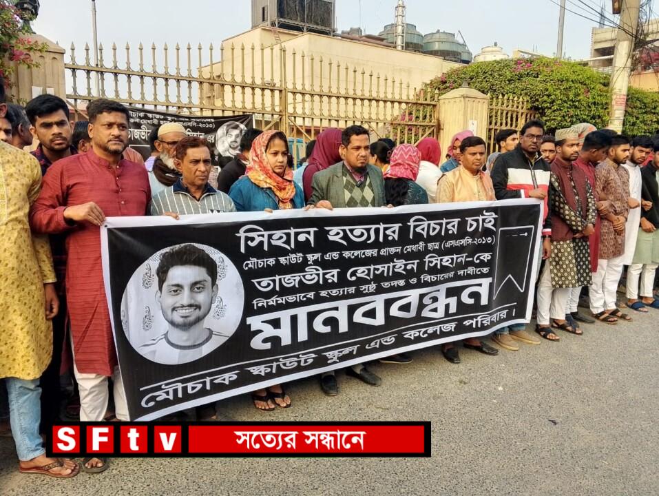 শাকিল হেসেন : গাজীপুরের কালিয়াকৈর উপজেলার মৌচাক স্কাউটস স্কুল এন্ড কলেজ পরিবার ও এলাকাবাসীর উদ্যোগে সিহান হত্যার প্রতিবাদ হত্যাকারীদের গ্রেফতার ও বিচারের দাবীতে মানববন্ধন অনুষ্ঠিত হয়েছে। আজ শুক্রবার ১৩ ডিসেম্বর বিকাল ৪টায় ঢাকা-টাঙ্গাইল মহাসড়কের মৌচাক বাসষ্ট্যান্ডে সিহান হত্যাকারীদের গ্রেপ্তারের দাবিতে মানববন্ধন ও বিক্ষোভ কর্মসুচি পালন করা হয়।