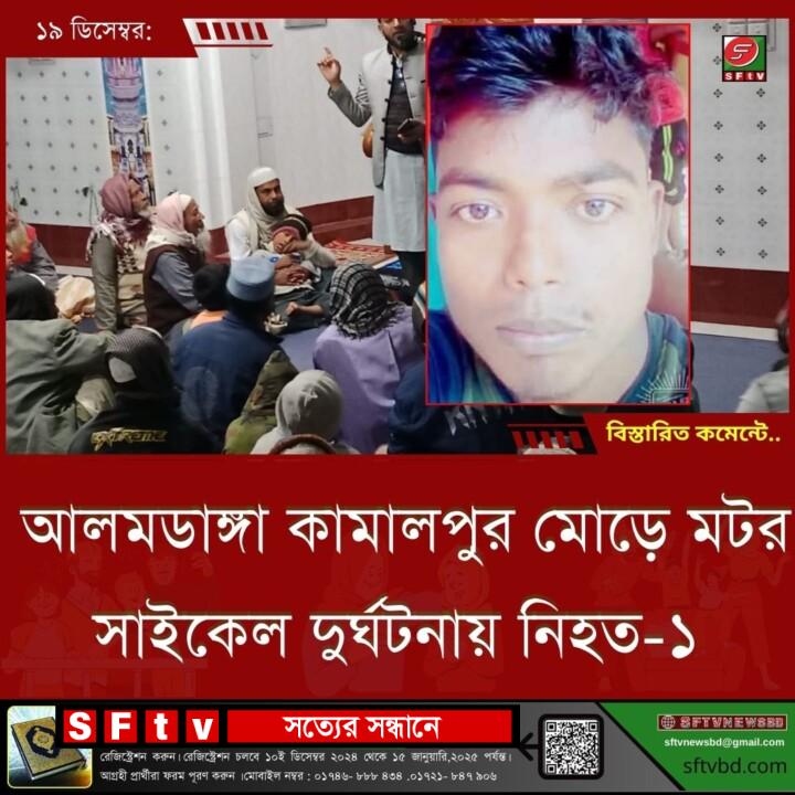 আলমডাঙ্গা কামালপুর মোড়ে কাছে মটর সাইকেল দুর্ঘটনায় একজন নিহত। ( ১৯ ডিসেম্বর)বৃহস্পতিবার সকাল দশটার সময় আলমডাঙ্গা থেকে ফেরার পথে হারদী ইউনিয়নের কেশবপুর গ্রামের ওমর আলীর ছেলে আব্দুল্লাহ রুজন (২৫)মোটরসাইকেল দুর্ঘটনায় নিহত হয়েছে। এই ঘটনা আলমডাঙ্গা কামালপুরের কাঠ ব্রীজ নামক স্থানে ঘটে।জানা গেছে আব্দুল্লাহ রুজন (২৫),রাজু (২৪), সৌরভ (২৫) সহ তিনজন মোটরসাইকেল যোগে আলমডাঙ্গা থেকে বাড়ি ফেরার পথে পাখি ভ্যানকে ওভারটেক করতে গেলে রোডের উপর সিটকে পড়ে। এ সময় স্থানীয়রা উদ্ধার করে কুষ্টিয়া সদর হাসপাতালে পাঠান। হাসপাতালে যাওয়ার আগেই পথিমধ্যে আব্দুল্লাহ রুজনের মৃত্যু হয়। উল্লেখ্য মটর সাইকেলের তিনজন আরোহী একই গ্রামের।রাজু ও সৌরভ সামান্য আঘাত পেয়েছে।রুজনের মৃত্যুর সংবাদ গ্রামে ছড়িয়ে পড়লে তার পরিবারে শোকের ছায়া নেমে আসে।তাকে এক নজর দেখার জন্য আত্মিয় স্বজন,প্রতিবেশিরা ভীড় জমায়। এ ব্যাপারে আলমডাঙ্গা থানা পুলিশ সন্ধ্যা ছয়টার সময় ঘটনাস্থলে উপস্থিত হয়ে সুরতহাল রিপোর্ট তৈরি করে লাশ দাফন করার অনুমতি দেন। সন্ধ্যা সাতটায় কেশবপুর গ্রামের কবরস্থানে জানাজা শেষে দাফন কাজ সম্পন্ন হয়।