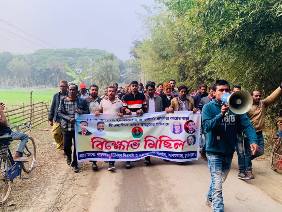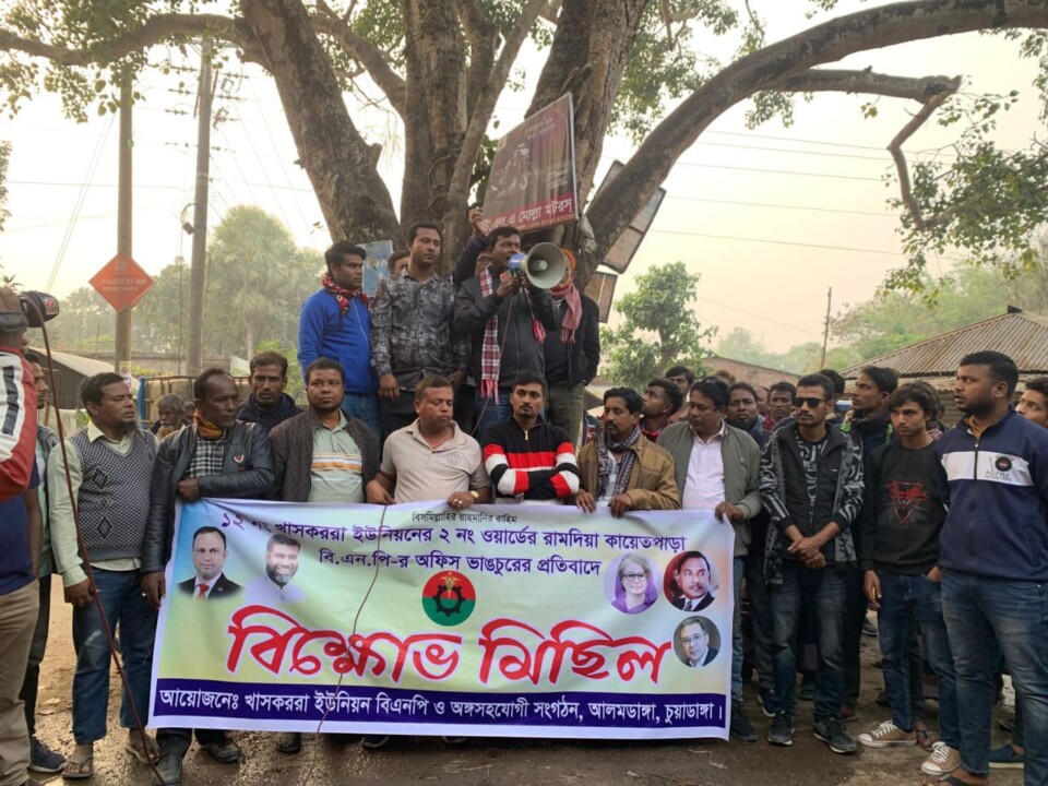 চুয়াডাঙ্গার আলমডাঙ্গা উপজেলার ১২ নং খাসকররা ইউনিয়নের ২ নং ওয়ার্ডের রামদিয়া কায়েতপাড়ায় বিএনপি অফিসে হামলা, ভাঙচুর ও লুটপাটের প্রতিবাদে সোমবার বিকেল ৩টায় বটতলা মোড়ে খাসকররা ইউনিয়ন বিএনপি ও এর অঙ্গসংগঠনের আয়োজনে এক বিক্ষোভ মিছিল অনুষ্ঠিত হয়।