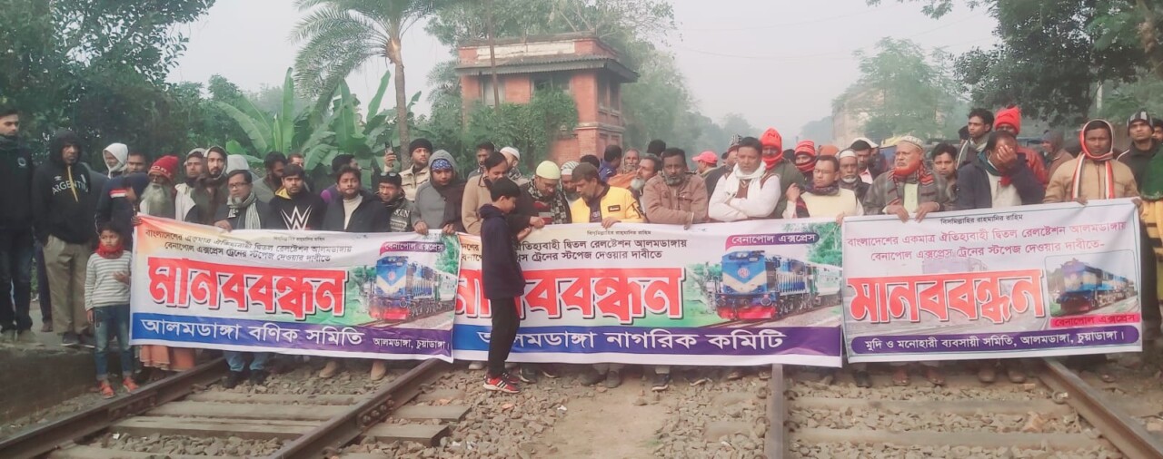 আলমডাঙ্গায় বেনাপোল এক্সপ্রেস ট্রেনের স্টপেজের দাবীতে নাগরিক কমিটি ও সর্বস্তরের মানুষের মানব বন্ধন কর্মসুচি পালিত হয়েছে।নাগরিক কমিটি বিএনপি,জামাত,বনিক সমিতি,মুদি ব্যাবসায়ি সমিতি,গার্মেন্টস সমিতি,খেলোয়াড় সমিতি,কলেজপাড়া কল্যান সমিতি,কাপড় ব্যাবসায়ি সমিতির নেতৃবৃন্দ বেনাপোল ট্রেন ১ ঘন্টা থামিয়ে রাখে।পরে জেলা প্রশাসকের নির্দেশে আলমডাঙ্গা উপজেলা নির্বাহী অফিসার শেখ মেহেদি ইসলাম,থানা অফিসার ইনচার্জ মাসুদুর রহমান, সেনা বাহিনির সদস্য গন ঘটনা স্থলে উপস্থিত হয়ে ট্রেন ছাড়ানোর জন্য অনুরোধ করেন।কিন্ত আলমডাঙ্গা বাসি স্লোগান দিতে থাকে বেনাপোল স্টপেজ দিতে হবে দিত হবে।গতকাল বিকেলে আলমডাঙ্গা নাগরিক কমিটি বিএনপি,জামাত, ,আলমডাঙ্গা বনিক সমিতি,আলমডাঙ্গা বৃহত্তর কাপড় ব্যাবসায়ি সমিতি,আলমডাঙ্গা গার্মেন্টস সমিতি,আলমডাঙ্গা কলেজ পাড়া কল্যান কমিটি,মুদি ব্যাবসায়ি সমিতি সহ বিভিন্ন রাজনৈতিক দলের নেতা কর্মি রেলওয়ে স্টেশনে মানব বন্ধনে অংশ নেয়।