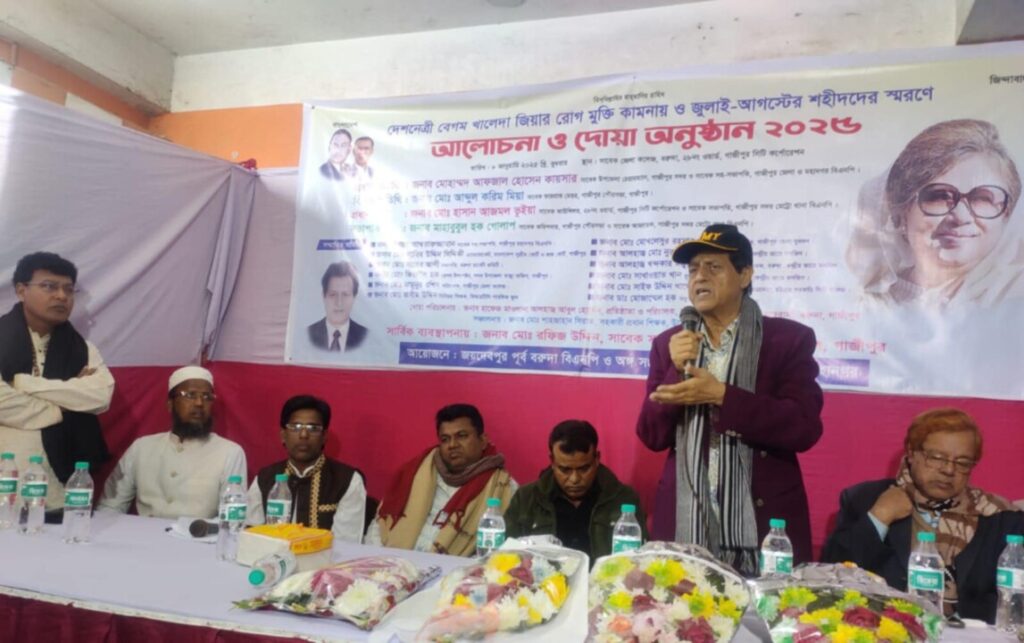 মোঃ হাইউল উদ্দিন খান : গাজীপুরে বেগম খালেদা জিয়ার রোগ মুক্তি ও জুলাই,আগস্টে শহীদদের স্মরণে আলোচনা সভা ও দোয়া অনুষ্ঠিত হয়েছে। বুধবার (৮ জানুয়ারি ২০২৫)রাতে গাজীপুর সিটি কর্পোরেশনের ২৮ নং ওয়ার্ডের জয়দেবপুর পূর্ব বরুদা বিএনপির ও অঙ্গ সংগঠনের আয়োজনে সাবেক জেলা কলেজ মিলনায়তনে এই অনুষ্ঠানের আয়োজন করা হয়। উক্ত অনুষ্ঠানে গাজীপুর উমেদা বেগম বালিকা উচ্চ বিদ্যালয়ের সহকারী প্রধান শিক্ষক মো: শাহজাহান সিরাজের সঞ্চালনায়, এ সময় প্রধান অতিথি হিসেবে বক্তব্য রাখেন, গাজীপুর সদর উপজেলার সাবেক চেয়ারম্যান ও গাজীপুর মহানগর বিএনপি’র সাবেক সহ-সভাপতি মোঃ আফজাল হোসেন কায়সার। প্রধান বক্তা হিসেবে বক্তব্য রাখেন,সিটি কর্পোরেশনের ২৮ নং ওয়ার্ডের সাবেক কাউন্সিলর মো: হাসান আজমল ভূঁইয়া।বিশেষ অতিথি হিসেবে উপস্থিত ছিলেন, গাজীপুর মহানগর বিএনপির সাবেক সহ-সভাপতি সৈয়দ আখতারুজ্জামান, গাজীপুর জেলা যুবদলের সাবেক সাধারণ সম্পাদক মো: মোখলেছুর রহমান, বাংলাদেশ সুপ্রিম কোর্ট ও জজকোর্ট গাজীপুর এর এডভোকেট লাবিব উদ্দিন সিদ্দিকী, বরুদা কেন্দ্রীয় জামে মসজিদের সভাপতি,মোঃ নুরুল ইসলাম, বরুদা কেন্দ্রীয় জামে মসজিদের সাধারণ সম্পাদক, আলহাজ্ব খন্দকার মঞ্জুরুল করিম, বরুদা কেন্দ্রীয় জামে মসজিদের যুগ্ন-সাধারণ সম্পাদক, মোঃ সাখাওয়াত খান,২৮ নং ওয়ার্ডের বিএনপির সাবেক সাধারন সম্পাদক মামুনুর রশিদ, এডভোকেট সালাউদ্দিন রুহুল, বরুদা মার্কেট কমিটির সভাপতি মোঃ সাহেব আলী, বিআরটিসি পাবলিক স্কুলের সিনিয়র শিক্ষক মো: জসিম উদ্দিন, সাইফুদ্দিন। অন্যান্যদের মধ্যে আরো উপস্থিত ছিলেন, জেলা- মহানগর বিএনপি ও অন্যান্য অঙ্গ সহযোগী সংগঠনের নেতৃবৃন্দ সহ এলাকার গণ্যমান্য ব্যক্তিবর্গ । দোয়া অনুষ্ঠানটি’র সার্বিক ব্যবস্থাপনায় ছিলেন, গাজীপুর পৌর যুবদলের সাবেক সাধারণ সম্পাদক রফিজ উদ্দিন।