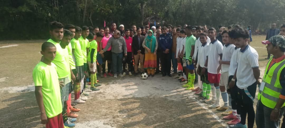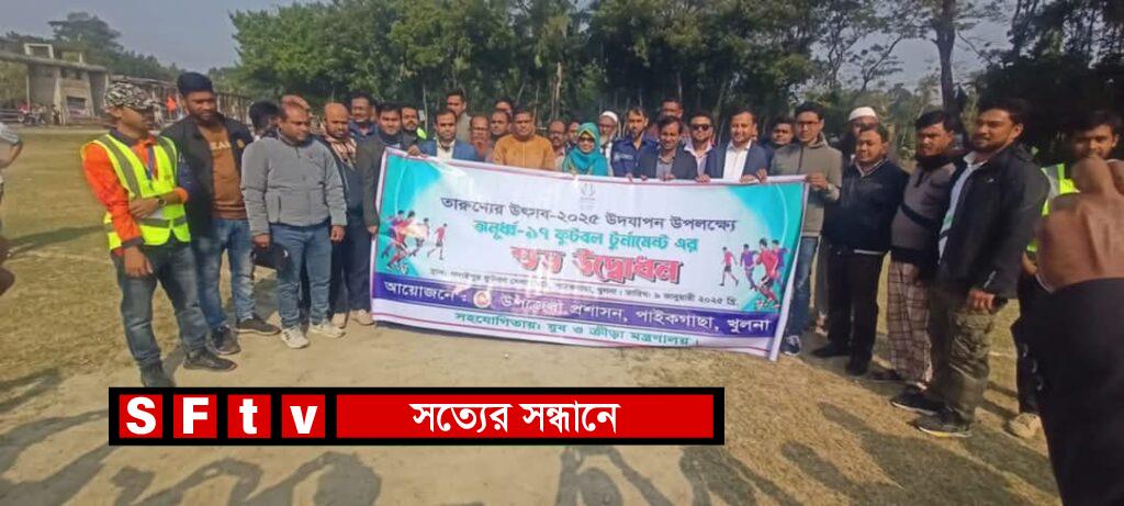 এম জালাল উদ্দীন : পাইকগাছায় তারুণ্যের উৎসব-২০২৫ উদযাপন উপলক্ষ্যে অনূর্ধ্ব-১৭ ফুটবল টুর্নামেন্ট উদ্বোধন করেন উপজেলা নির্বাহী অফিসার মাহেরা নাজনীন। এসময়ে তিনি বলেন, ক্রীড়া প্রতিযোগিতা যুব সমাজকে সৃজনশীল কাজে উৎসাহিত করবে এবং তাদেরকে মাদক ও অপরাধমূলক কাজ থেকে দূরে রাখবে। ক্রীড়ার মাধ্যমে তরুণ প্রজন্মের শারীরিক ও মানসিক বিকাশ ঘটে। বৃহস্পতিবার সকালে উপজেলা প্রশাসনের আয়োজনে পূর্ব নির্ধারিত গদাইপুর ফুটবল মাঠে উক্ত খেলার আয়োজন করা হয়। উদ্বোধনী অনুষ্ঠানে বিশেষ অতিথি ছিলেন, উপজেলা সহকারী কমিশনার (ভূমি) ইফতেখারুল ইসলাম শামীম ও থানা অফিসার ইনচার্জ মোঃ সবজেল হোসেন।