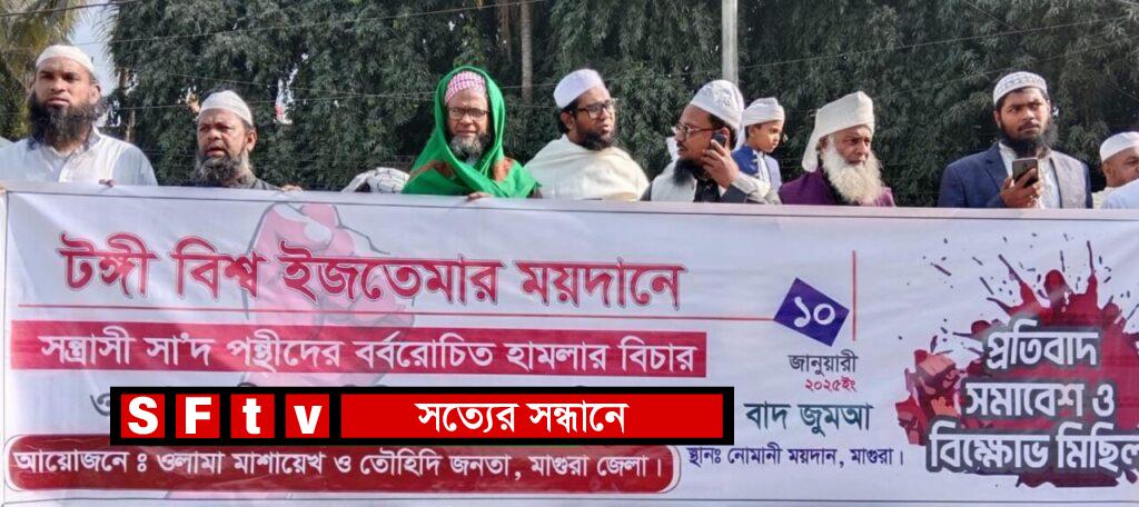 তৌহিদ :টঙ্গী বিশ্ব ইজতেমার ময়দানে সন্ত্রাসী সা’দ পন্থীদের বর্বরোচিত হামলার বিচার ও সা’দ পন্থীদের নিষিদ্ধকরণের দাবীতে মাগুরাতে সমাবেশ ও বিক্ষোভ মিছিল অনুষ্ঠিত। শুক্রবার ১০ জানুয়ারী বাদ জুম্মা মাগুরা ওলামায়ে মাশায়েক ও তৌহিদী জনতার আয়োজনে শহরের নোমানী ময়দানে এ সমাবেশ অনুষ্ঠিত হয়।