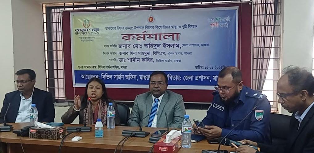 তৌহিদ : মাগুরাতে তারুণ্যের উৎসব-২০২৫ উপলক্ষে কিশোর কিশোরীদের স্বাস্থ্য ও পুষ্টি বিষয়ক কর্মশালা হয়েছে। সোমবার ১৩ জানুয়ারী মাগুরা সিভিল সার্জন অফিসের আয়জনে জেলা প্রশাসনের সহযোগিতায় সিভিল সার্জন অফিসের সম্মেলন কক্ষে এই কর্মশালা অনুষ্ঠিত হয়। কর্মশালায় মাগুরা জেলা সিভিল সার্জন মোঃ শামীম কবির এর সভাপতিত্বে প্রধান অতিথি হিসেবে উপস্থিত ছিলেন মাগুরা জেলা প্রশাসক মো. অহিদুল ইসলাম,বিশেষ অতিথি হিসেবে উপস্থিত ছিলেন মাগুরা জেলা পুলিশ সুপার মিনা মাহমুদা।