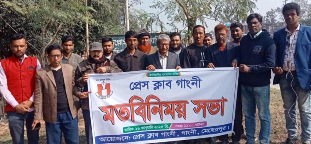 তৌহিদ; মেহেরপুরের গাংনীতে প্রেসক্লাব গাংনীর সাংবাদিকদের নিয়ে এক মতবিনিময় সভা অনুষ্ঠিত হয়েছে। বৃহস্পতিবার (১৬ জানুয়ারি), সকাল ১১,৩০ টার সময় গাংনী- ঝিনিপুল সড়ক অডিটোরিয়ামে এ মতবিনিময় সভা অনুষ্ঠিত হয়। প্রেসক্লাব গাংনী কার্যনির্বাহী কমিটির সাধারণ সম্পাদক ও দৈনিক ভোরের সময় ও পদ্দা টিভি গাংনী প্রতিনিধি তারিফুল ইসলাম জীবন এর সঞ্চালনায় সভায় স্বাগত বক্তব্য রাখেন, প্রেস ক্লাব গাংনী সভাপতি ও দৈনিক বাংলা ডাক পত্রিকার স্টাফ রিপোর্টার শাহাজান সেলিম , বিশেষ অতিথি হিসেবে উপস্থিত ছিলেন দৈনিক আমাদের সূর্যোদয় পত্রিকার প্রকাশক ও সম্পাদক আবুল কাশেম অনুরাগী, এছাড়াও আরো উপস্থিত ছিলেন সিনিয়র সহ-সভাপতি দৈনিক আমাদের সূর্যোদয়ের নির্বাহী সম্পাদক ডাক্তার আল আমিন, সহ-সভাপতি যথাক্রমে আজিজুল হক রানু দৈনিক আমাদের সূর্যোদয়, কামাল হোসেন খান দৈনিক মানবাধিকার, আব্দুল আজিজ দৈনিক অন্যায়ের প্রতিবাদ, সিদ্দিকুর রহমান দৈনিক আমাদের সূর্যোদয়, আব্দুল হামিদ ক্রাইম রিপোর্টার দৈনিক মানবাধিকার, জিয়াউল আলম মামুন দৈনিক ভোরের সময়, সাধারণ সম্পাদক তরিকুল ইসলাম জীবন যুগ্ম সাধারণ সম্পাদক যথাক্রমে রফিকুল ইসলাম দি ডেইলি মরনিং গ্লোরি যুগ্ম সাধারণ সম্পাদক আসাদুল্লাহ আল গালিব দৈনিক পশ্চিমঅঞ্চল, মাহাবুল ইসলাম দৈনিক দেশ সেবা, সাংগঠনিক সম্পাদক শাহাদত হোসেন দৈনিক আকাশ খবর , অর্থ সম্পাদক জসীমউদ্দীন রূপসী বাংলা টিভি, দপ্তর সম্পাদক সুজন আলী, দৈনিক দেশ সেবা, প্রচার সম্পাদক কাউসার হামিদ, দৈনিক সবুজ বাংলাদেশ, তথ্য ও প্রযুক্তি বিষয়ক সম্পাদক উম্মে তানিয়া দৈনিক আমাদের সূর্যোদয়, ধর্ম বিষয়ক সম্পাদক আমিনুর দৈনিক মানবাধিকার, সেলিম রেজা ক্রিয়া ও সাংস্কৃতিক বিষয়ক সম্পাদক দৈনিক মানবাধিকার, এছাড়াও উপস্থিত ছিলেন নির্বাহী সদস্য যথাক্রমে আনোয়ার হোসেন, জাহাঙ্গীর আলম, আরিফুল ইসলাম, মহিবুল ইসলাম, মোছাম্মদ আইরিন সুলতানা, শহিদুল ইসলাম শাওন, ও বিপ্লব হোসেন প্রমুখ, এছাড়াও উপস্থিত ছিলেন দৈনিক সমাচারের জেলা প্রতিনিধি মাজিদ আল মামুন ও সময়ের সমীকরণ মাহাবুল ইসলাম, সভায় গুরুত্বপূর্ণ বিষয়াদি নিয়ে আলোচনা করা হয়।