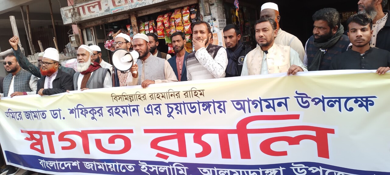 ১৭ জানুয়ারি শুক্রবার বেলা ২ ঘটিকার সময় চুয়াডাঙ্গা টাউন ফুটবল মাঠে বর্তমান সময়ের জনমানুষের সবচেয়ে প্রিয় নেতা ডাক্তার শফিকুর রহমান কর্মী সম্মেলন আগমন উপলক্ষে বিকেল সাড়ে তিনটায় স্বাগত র্যালি অনুষ্ঠিত হয়েছে। বাংলাদেশ জামায়াতে ইসলামী আলমডাঙ্গা উপজেলা আমীর প্রভাষক শফিউল আলম বকুলের নেতৃত্বে সেক্রেটারি মামুন রেজার পরিচালনায় র্যালিটি মডেল মসজিদের সামনে থেকে শুরু হয়ে হাই রোড চারতলা মোড় হয়ে কাচা বাজার দিয়ে আল তাইয়েবার মোড়ে এসে সমাপ্ত হয়। সংক্ষিপ্ত সমাবেশে উপজেলা আমীর প্রভাষক শফিউল আলম বকুল বলেন আমাদের দেশের জন মানুষের প্রিয় নেতা ডাক্তার শফিকুর রহমানের নির্দশনামুলক আলোচনা শোনার জন্য আপনাদের সবাইকে সম্মেলনে যাওয়ার অনুরোধ রইল। গত সোমবার থেকে প্রতিদিন বাদ আছর শোভাযাত্রা শুরু হয়েছিল যা বৃহস্পতিবার নাগাদ শেষ হয়। এই শোভাযাত্রায় সতস্ফূর্তভাবে বিভিন্ন ইউনিয়ন অংশগ্রহণের জন্য উপজেলা আমীর সবাইকে ধন্যবাদের মাধ্যমে সমাপ্ত ঘোষণা করেন।