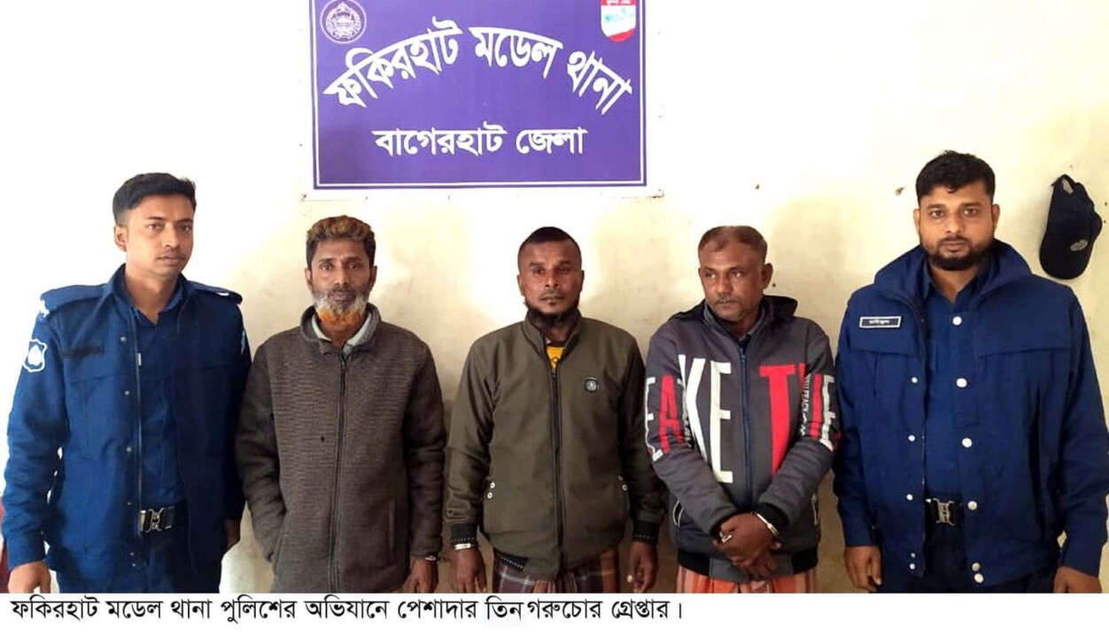 ফকিরহাটে পেশাদার তিন গরু চোর আটক, ৪টি গরু উদ্ধার