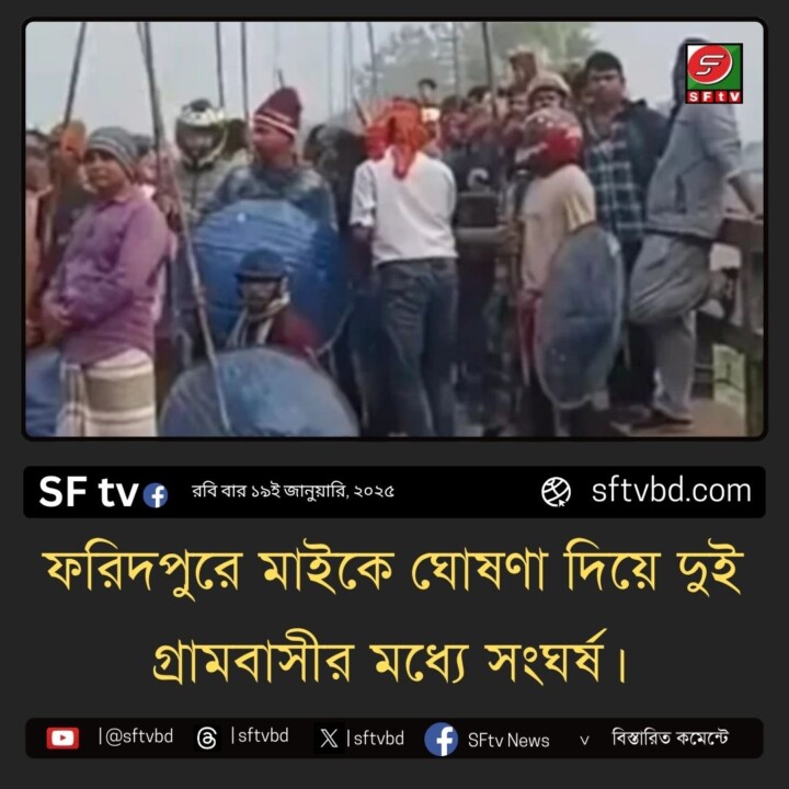মোঃ ইলিয়াছ খান ; ফরিদপুরে মাইকে ঘোষণা দিয়ে দুই গ্রামবাসীর মধ্যে সংঘর্ষ। আহত ৫০ গ্রামের উভয় বাসিন্দারা দেশীয় অস্ত্র ইট পাটকেল হাতে নিয়ে সংঘর্ষে জড়িয়ে পড়ে। ফরিদপুরের নগরকান্দায় আধিপত্য বিস্তারনে মসজিদের মাইকে ঘোষণা দিয়ে দুই গ্রামবাসীর মধ্যে দফায় দফা সংঘর্ষেযর ঘটনা ঘটেছে। এ সময় নগরকান্দা থানার ভাগ্য কর্মকর্তা ওসি সহ ৬ ঔ পুলিশ সদস্য সহ অন্তত ৫০ জন আহত হয়েছেন। আহতদের মধ্যে অন্তত ত্রিশ জনকে ফরিদপুর মেডিকেল কলেজ হাসপাতালে অনগরকান্দা উপজেলা স্বাস্থ্য কমপ্লেক্সে ভর্তি করা হয়েছে। এদিকে সংঘর্ষের সময় বাড়িঘরসহ বিভিন্ন ব্যবসা প্রতিষ্ঠানে ব্যাপক হামলা ও ভাঙচুর করা হয়েছে বলে জানা যায়। এতে পুরো এলাকা রণক্ষেত্র পরিণত হয়। আজ শনিবার ১৮ জানুয়ারি ফুলশটি ইউনিয়নের ফলিতা গ্রামবাসী সঙ্গে নগরকান্দা পৌরসভার মিরাকান্দা গ্রামবাসীর সংঘর্ষে এই ঘটনাটি ঘটেছে। স্থানীয়রা জানান খলিফা মাদরাসায় শুক্রবার রাতে ওয়াজ মাহফিল চলাকালে এলাকায় আধিপত্য বিস্তার নিয়ে মেরে কান্দাও সুলেখা গ্রামবাসীর মধ্যে পাল্টাপাল্টি ধাওয়া পাল্টা ঘটে। খবর পেয়ে পুলিশ গেলে পরিস্থিতি শান্ত করলেও গ্রামবাসীর মধ্যে রাতভর উত্তেজনা চলছিল। শনিবার সকালে শনিবার সকালে সংশ্লিষ্ট মসজিদের মাইকে ঘোষণা দিয়ে ও ভাই গ্রামের শত শত বাসিন্দা দেশি অস্ত্র ঢাল কাতরা সরকি বল্লম রামদা ও ইট পাটকেল হাতে নিয়ে সংঘর্ষে জড়িয়ে পড়ে সকাল থেকে বেলা ১১ টা পর্যন্ত চলে এই সংঘর্ষ। ফরিদপুরের সিনিয়র সহকারী পুলিশ সুপার (নগরকান্দা সার্কেল) মোঃ আসাদুজ্জামান শাকিল বলেন। পুলিশ ঘটনাস্থলে গিয়ে পরিস্থিতি নিয়ন্ত্রণে আনে। এলাকার পরিবেশ এখন শান্ত রয়েছে। পরে যাতে আর কোন অপ্রীতিকর ঘটনা না ঘটে সেজন্য অতিরিক্ত পুলিশ রাখা হয়েছে।