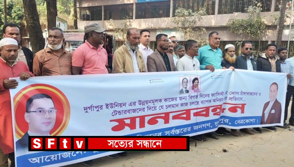 ঘন্টাব্যাপী মানববন্ধনে ইউনিয়ন বিএনপি‘র আহবায়ক ফজলুল হকের সভাপতিত্বে বক্তব্য রাখেন, উপজেলা বিএনপির যুগ্ম আহ্বায়ক মোজাম্মেল হক, ইউনিয়ন বিএনপির সিনিয়র যুগ্ন-আহবায়ক রফিকুল ইসলাম, সদস্য সচিব বোরহান উদ্দিন, উপজেলা স্বেচ্ছাসেবক দলের আহ্বায়ক মীর্জা নজরুল, শ্রমিক দলের সাবেক সভাপতি শফিকুল ইসলাম বাবুল, শিক্ষক মোস্তাক আহমেদ, ইউনিয়ন যুবদলের সিনিয়র যুগ্ম আহ্বায়ক জালাল উদ্দিন, ইউনিয়ন স্বেচ্ছাসেবক দলের আহ্বায়ক শফিকুল ইসলাম হাসান সহ এলাকার জনসাধারণ ।মানববন্ধনে বক্তারা বলেন, দুর্গাপুর ইউনিয়নে ৯টি উন্নয়নমূলক কাজ চলমান রয়েছে। কোটি টাকার প্রতিটি কাজেই নিম্নমানের সামগ্রী ব্যবহার করা হয়েছে। সরকারিভাবে কোন তদারকি না থাকায় প্রশ্নবিদ্ধ হচ্ছে কাজের মান। টানানো হয়নি কোন সিটিজেন চার্টার। আমরা চাই ইস্টিমিট অনুযায়ী সঠিক মানের সামগ্রী দিয়ে কাজ গুলো করা হউক। আজকের মানববন্ধনের পরে যদি কাজ গুলো সঠিকভাবে করা না হয়, তাহলে ইউনিয়বাসীকে নিয়ে প্রতিটি কাজের সাইডে গিয়ে সকলে মিলে অনশন করবো।
