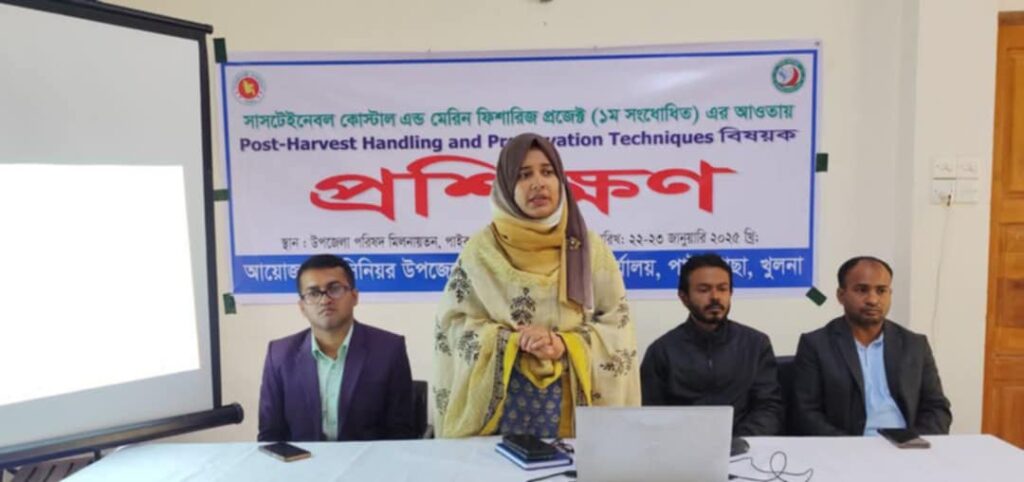 এম জালাল উদ্দীন: পাইকগাছায় সাসটেইনেবল কোস্টাল এন্ড মেরিন ফেশারিজ প্রজেক্ট (১ম সংশোধীত) আওতায় মাছ আহরণোত্তর পরিচর্চা ও সংরক্ষণ কৌশল বিষয়ক প্রশিক্ষণ কর্মসূচি অনুষ্ঠিত হয়েছে।এ উপলক্ষে বুধবার সকাল ১০টায় উপজেলা প্রাণিসম্পদ অধিদপ্তরের সম্মেলন কক্ষে আয়োজিত প্রশিক্ষণ কর্মসূচির উদ্বোধন করেন, উপজেলা নির্বাহী অফিসার মাহেরা নাজনীন। প্রশিক্ষক হিসেবে সিনিয়র উপজেলা মৎস্য কর্মকর্তা সৈকত মল্লিক, প্রাণিসম্পদ কর্মকর্তা ডা. পার্থ প্রতিম রায়, মেরিন ফিশারিজ কর্মকর্তা মো. কাওছার হোসেন আকন উপস্থিত ছিলেন। উপকূলীয় ও সামুদ্রিক মৎস্য সম্পদ সংরক্ষণ এবং ব্যবস্থাপনা বিষয়ক ২ দিনব্যাপী এ প্রশিক্ষণে উপজেলার ৬ টি ইউনিয়ন থেকে ২৫ জন জেলে অংশ গ্রহণ করেন।