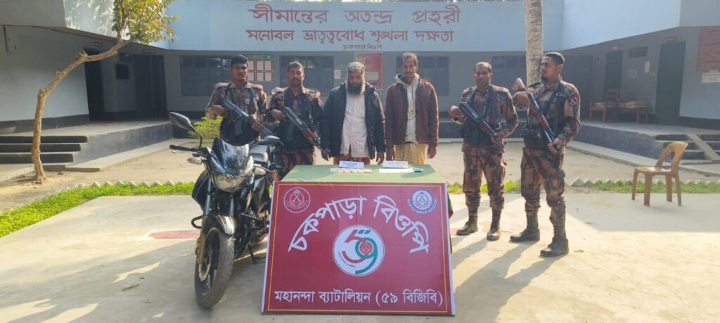 মাহিদুল ইসলাম ফরহাদ ; ২৩ জানুয়ারি ২০২৫ তারিখ সীমান্ত দিয়ে মাদকদ্রব্য পাচার হওয়ার সম্ভাবনা রয়েছে। এপ্রেক্ষিতে মহানন্দা ব্যাটালিয়নের অধিনায়ক লেঃ কর্নেল গোলাম কিবরিয়া, বিজিবিএম, বিজিওএম এর পরিকল্পনা ও নির্দেশনায় চকপাড়া বিওপিতে কর্মরত নায়েক মোঃ এনামুল হক এর নেতৃত্বে ০১টি বিশেষ টহল দল সীমান্ত পিলার ১৮৪/২-এস হতে আনুমানিক ০৩ কিঃ মিঃ বাংলাদেশের অভ্যন্তরে চাঁপাইনবাবগঞ্জ জেলার শিবগঞ্জ থানাধীন শাহাবাজপুর ইউনিয়নের মোসলেমপুর বাজার রোড সংলগ্ন ব্রীজের পার্শ্বে অভিযান পরিচালনা করে। উক্ত অভিযানে টহলদল ০২ জন আসামী (১) মোঃ মতিউর রহমান (৫০), পিতা-মৃত ইউসুফ আলী এবং (২) মোঃ রাজীব আলী (৩৮), পিতা-মৃত আবু তালেব উভয়ের গ্রাম-পারদিল্লানপুর, পোষ্ট-কানসাট, থানা-শিবগঞ্জ, জেলা-চাঁপাইনবাবগঞ্জকে ১৫ পিস ভারতীয় ইয়াবা, ৫০০ পিস ট্যাবলেট, ০১টি ব্যবহৃত মোবইল ফোন (বাটন) এবং ০১টি মোটরসাইকেল (Apache RTR 150cc) সহ আটক করতে সক্ষম হয়। আটককৃত আসামীসহ মালামাল মামলা করতঃ শিবগঞ্জ থানায় হস্তান্তরের কার্যক্রম প্রক্রিয়াধীন। এ ব্যাপারে মহানন্দা ব্যাটালিয়ন (৫৯ বিজিবি) এর অধিনায়ক লেঃ কর্নেল গোলাম কিবরিয়া, বিজিবিএম, বিজিওএম বিষয়টির সত্যতা নিশ্চিত করেছেন।