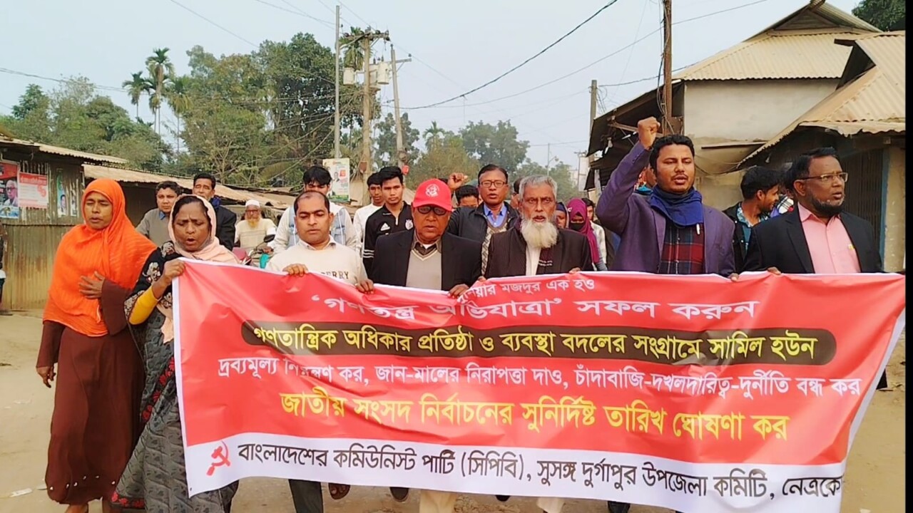 মোরশেদ আলম, দুর্গাপুর, বাংলাদেশের কমিউনিস্ট পার্টি (সিপিবি) কেন্দ্রীয় কমিটির ঘোষিত কর্মসূচি ২১ থেকে ২৭ জানুয়ারি ২০২৫ দেশব্যাপী “গণতন্ত্র অভিযাত্রা” পালন করেছে সিপিবি সুসঙ্গ দুর্গাপুর উপজেলা কমিটি।শুক্রবার বিকাল ৩ টায় নেত্রকোনা জেলার দুর্গাপুর প্রেসক্লাব মোড়ে গণতন্ত্র অভিযাত্রা কর্মসূচি বিষয়ে সিপিবি দুর্গাপুর উপজেলা কমিটির সহকারী সাধারণ সম্পাদক কমরেড মোরশেদ আলম এর সঞ্চালনায় আলোচনা করেন সিপিবি দুর্গাপুর উপজেলা কমিটির সভাপতি কমরেড আলকাছ উদ্দিন মীর, সাধারণ সম্পাদক কমরেড রুপন কুমার সরকার, উপজেলা যুব ইউনিয়ন সভাপতি নজরুল ইসলাম, উপজেলা ছাত্র ইউনিয়ন সভাপতি নুর আলম খান প্রমুখ।পরে একটি মিছিল দুর্গাপুর শহরের প্রধান প্রধান সড়কে মিছিল করে সোমেশ্বরী নদী পাড় হয়ে শিবগঞ্জ বাজারে গিয়ে একটি হাটসভা অনুষ্ঠিত করেন।উল্লেখ্য যে, সারাদেশে পদযাত্রা গণসংযোগ করছেন কেন্দ্রীয় কমিটির নেতৃবৃন্দ সহ জেলা, উপজেলা কমিটির নেতৃবৃন্দ। জুলাই আগস্ট ২০২৪ হত্যাকান্ডের বিচার, আহতদের চিকিৎসা, ক্ষতিগ্রস্তদের পুনর্বাসন, দ্রব্যমূল্য নিয়ন্ত্রণ, বর্ধিত ভ্যাট-ট্যাক্স প্রত্যাহার, জান-মালের নিরাপত্তা প্রদান, চাঁদাবাজি-দখলদারিত্ব-দুর্নীতি-হামলা বন্ধ, জাতীয় সংসদের সুনির্দিষ্ট তারিখ ঘোষণাসহ শ্রমজীবী মেহনতি মানুষের দাবি মেনে নিতে অর্ন্তবর্তীকালীন সরকারের প্রতি আহ্বান জানাতে এবং গণতান্ত্রিক অধিকার প্রতিষ্ঠা ও ব্যবস্থা বদলের সংগ্রাম এগিয়ে নেওয়া ও নীতিনিষ্ঠ রাজনীতির পতাকা তলে দেশবাসীকে সমবেত হবার আহ্বান জানাতে গত ২১ জানুয়ারি থেকে আগামী ২৭ জানুয়ারি পর্যন্ত দেশব্যাপী “গণতন্ত্র অভিযাত্রা” করবে বাংলাদেশের কমিউনিস্ট পার্টি (সিপিবি)।