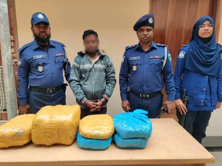 তরিকুল মোল্লা ; বাগেরহাট সদর মডেল থানা পুলিশ অভিযান চালিয়ে ৯ কেজি ৫০০ গ্রাম গাঁজাসহ কবির হাওলাদার (৩০) নামে এক মাদক ব্যবসায়ীকে আটক করেছেন।পুলিশ জানায়, জব্দকৃত ৯ কেজি ৫০০ গ্রাম গাঁজার আনুমানিক বাজার মূল্য দুই লক্ষ পঁচাশি হাজার টাকা।শনিবার (২৫ জানুয়ারি) ২:৩৫ ঘটিকায় বাগেরহাটের পুলিশ সুপার মোঃ তৌহিদুল আরিফ এর নির্দেশনায় অতিরিক্ত পুলিশ সুপার (সদর সার্কেল) মোঃ শামীম হোসেনের সার্বিক তত্ত্বাবধানে এস আই গৌতম কুমার মন্ডলের নেতৃত্বে বাগেরহাট সদর মডেল থানার এস আই মোঃ আবু হানিফ কামাল’সহ একটি চৌকস টিম বাগেরহাট সদরের কাড়াপাড়া ইউনিয়নের গোবরদিয়া গ্রামস্থ মারিয়ার পল্লীর সামনে শফিকুল ইসলাম এর মুদি দোকানের দক্ষিণ পাশে ফাঁকা জায়গায় গোপন সংবাদের ভিত্তিতে অভিযান চালিয়ে মোঃ কবির হাওলাদারকে আটক করে পুলিশ।আটককৃত কবির হাওলাদার বাগেরহাটের কচুয়া উপজেলার মাদারতলা গ্রামের মৃত জেহের আলী হাওলাদারের ছেলে।বাগেরহাট সদর মডেল থানার ভারপ্রাপ্ত কর্মকর্তা (ওসি) সাইদুর রহমান জানান, পুলিশের একটি চৌকস টিম গোপন সংবাদের ভিত্তিতে অভিযান চালিয়ে মাদক ব্যবসায়ী মোঃ কবির হাওলাদারকে ৯ কেজি ৫০০ গ্রাম গাঁজা’সহ আটক করেছে। উক্ত ঘটনায় মাদকদ্রব্য নিয়ন্ত্রন আইনে মামলা রুজু প্রক্রিয়াধীন রয়েছে।