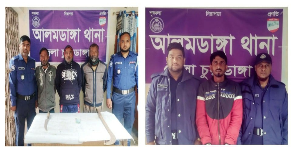 আলমডাঙ্গা থানার অফিসার ইনচার্জ মুঃ মাসুদুর রহমান এর নেতৃত্বে সঙ্গীয় অফিসার ফোর্সসহ থানা এলাকায় গ্রেফতারী পরোয়ানা তামিল, মাদক উদ্ধার অভিযান পরিচালনাকালে গোপন সংবাদের ভিত্তিতে আলমডাঙ্গা থানার মামলা নং-২০, তাং-২৯/০১/২০২৫ খ্রিঃ, ধারা: ৩৯৫/৩৯৭ পেনাল কোড এর আসামী ১। মোঃ বাইতুল ইসলাম(৪৫), পিতা- মৃত বোরহান আলী বিশ্বাস, সাং- মাজু, ২| মোঃ লিটন আলী(৩২), পিতা- মোঃ নজরুল ইসলাম, মাতা- মোছাঃ সালেহা খাতুন, সাং- বকসিপুর, ৩| মোঃ কেরামত আলী(৫০), পিতা- মোসলেম মন্ডল, ৪। মোঃ তমছের আলী(৫২), পিতা- মৃত হারান মন্ডল, ৫। মোঃ আশিক রানা(৪৫), পিতা- নবীছ উদ্দিন মন্ডল, সর্ব সাং- বকসিপুর (খালপাড়া), থানা- আলমডাঙ্গা, জেলা- চুয়াডাঙ্গা