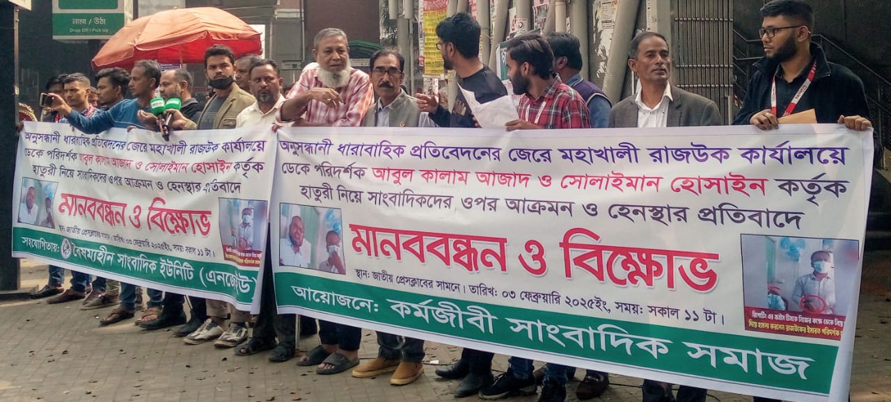 ঢাকা, সোমবার: রাজধানীর মহাখালীর রাজউক জোনাল অফিসে সাংবাদিকদের ওপর হামলা ও অপমানের ঘটনার প্রতিবাদে আজ জাতীয় প্রেস ক্লাবের সামনে মানববন্ধন ও বিক্ষোভ সমাবেশ অনুষ্ঠিত হয়েছে।গত বৃহস্পতিবার সাপ্তাহিক রিপোর্টিং পত্রিকার সাংবাদিক মাহতাবুর রহমান ও তার টিম দুর্নীতি নিয়ে তথ্য সংগ্রহ করতে গেলে ইমারত পরিদর্শক আবুল কালাম আজাদ ও সোলায়মান হোসেন তাদের আটকে রেখে হুমকি দেন এবং সোলায়মান হোসেন হাতুড়ি দিয়ে মারধর করেন। সাংবাদিকরা অভিযোগ করেন, সোলায়মানের বিরুদ্ধে দুর্নীতি, ঘুষ গ্রহণ ও ভয়ভীতি প্রদর্শনের একাধিক প্রতিবেদন প্রকাশিত হওয়ায় তিনি ক্ষুব্ধ হয়ে এ হামলা চালান। মানববন্ধনে বক্তারা ২৪ ঘণ্টার মধ্যে সোলায়মানের গ্রেফতার ও বিচার দাবি করেন, অন্যথায় উচ্চ আদালতে যাওয়ার হুঁশিয়ারি দেন।